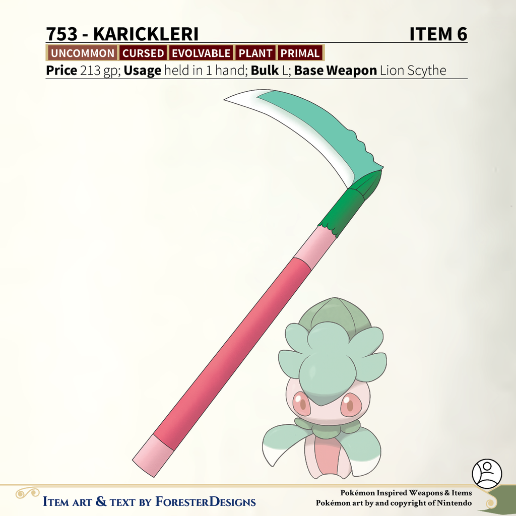A #PF2e conversion of my older #Pokemon #MagicItems, with a #Fomantis lion #scythe to soak in the sun
