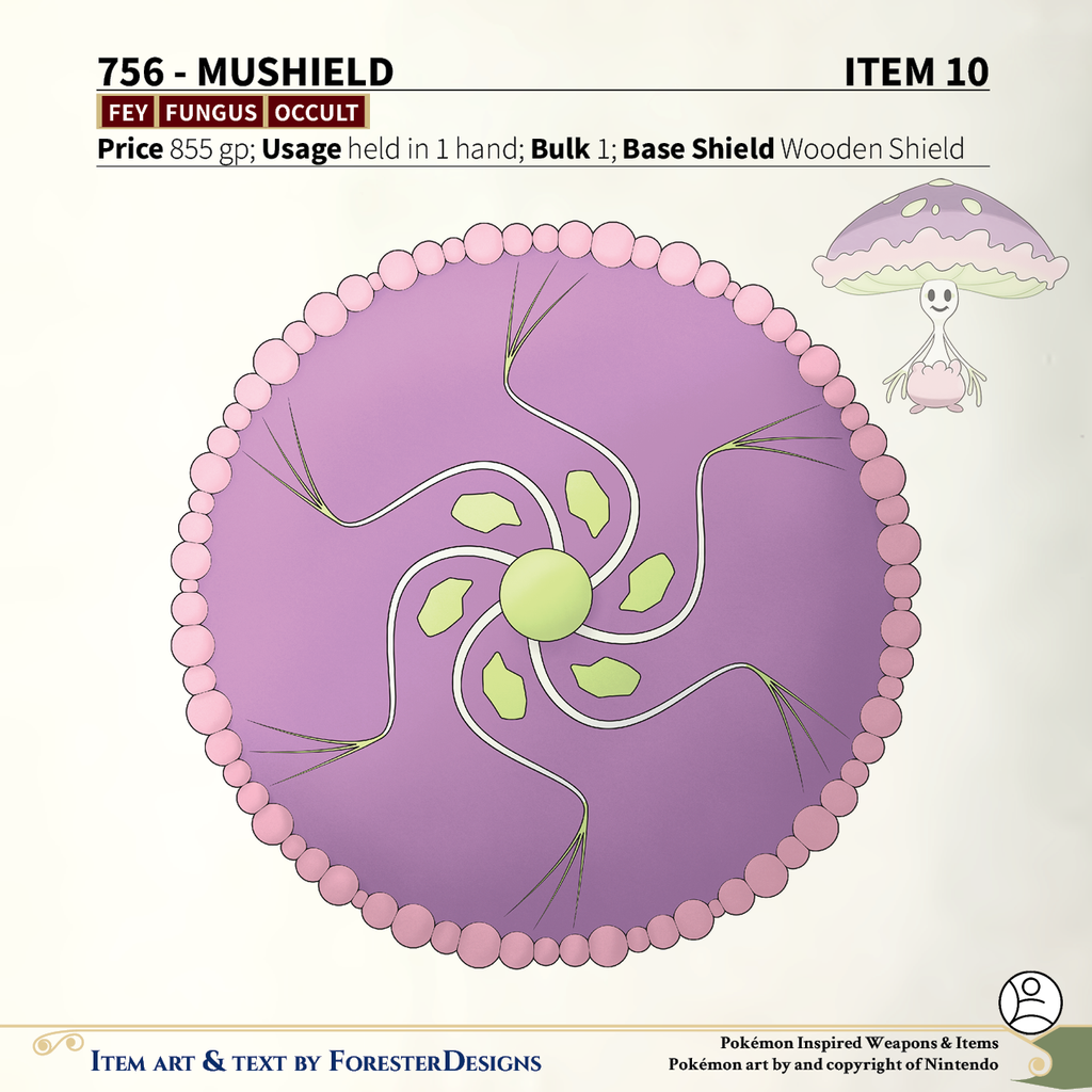 A #PF2e conversion of my older #Pokemon #MagicItems, with a #Shiinotic #shield to sap your enemies' strength
