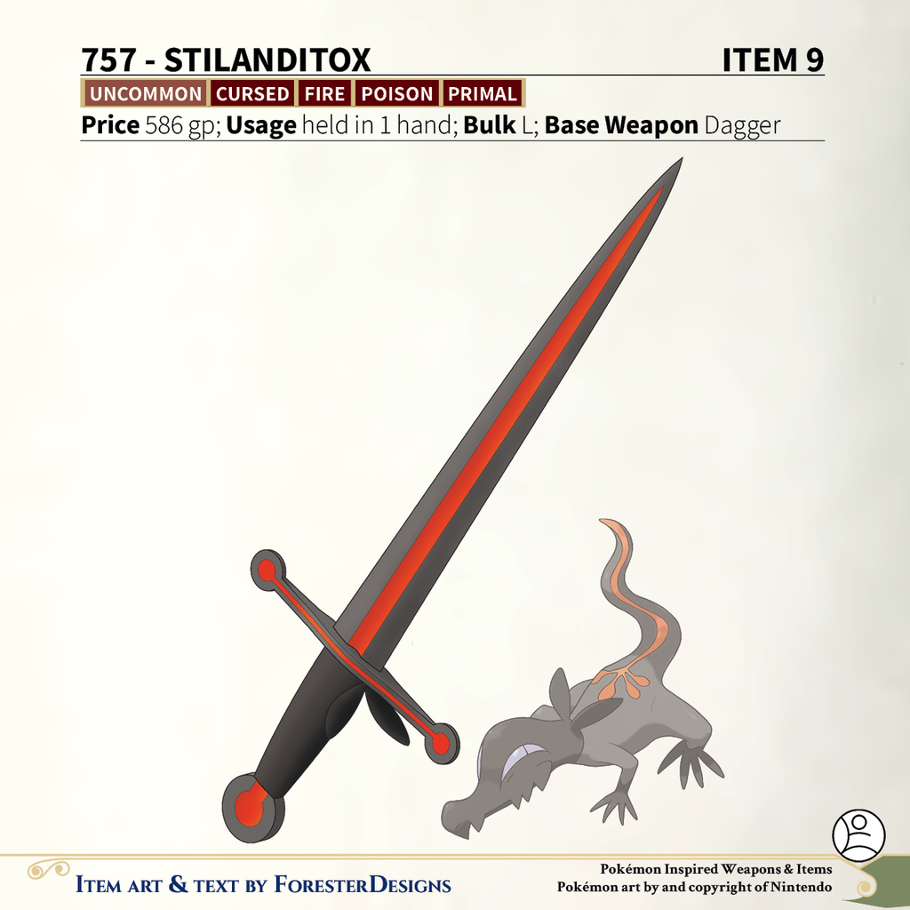 A #PF2e conversion of my older #Pokemon #MagicItems, with a #Salandit #dagger to make you really helpful