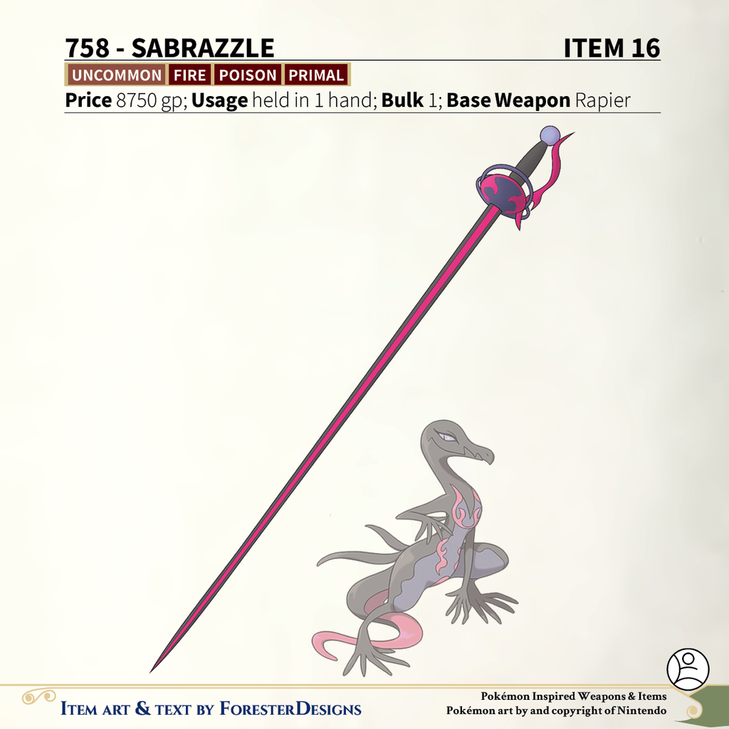A #PF2e conversion of my older #Pokemon #MagicItems, with a #Salazzle #rapier to take other's hearts in your hands