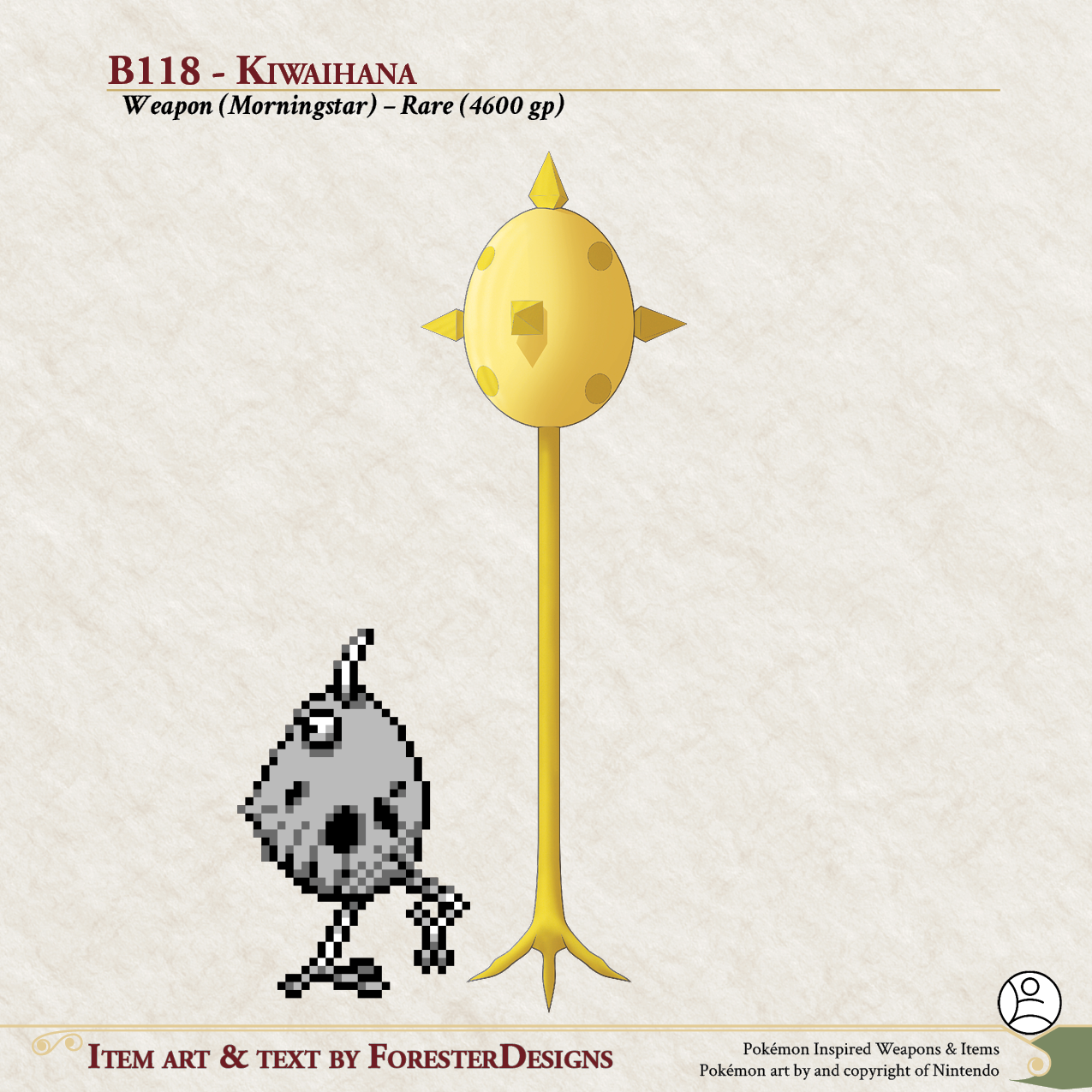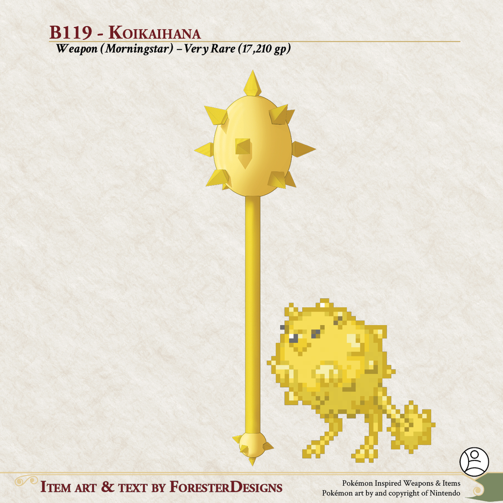 My #TTRPG #Pokemon #MagicItem of the Day in both #DnD and #PF2e, with a #Kiwi #morningstar to poison the uninvited!