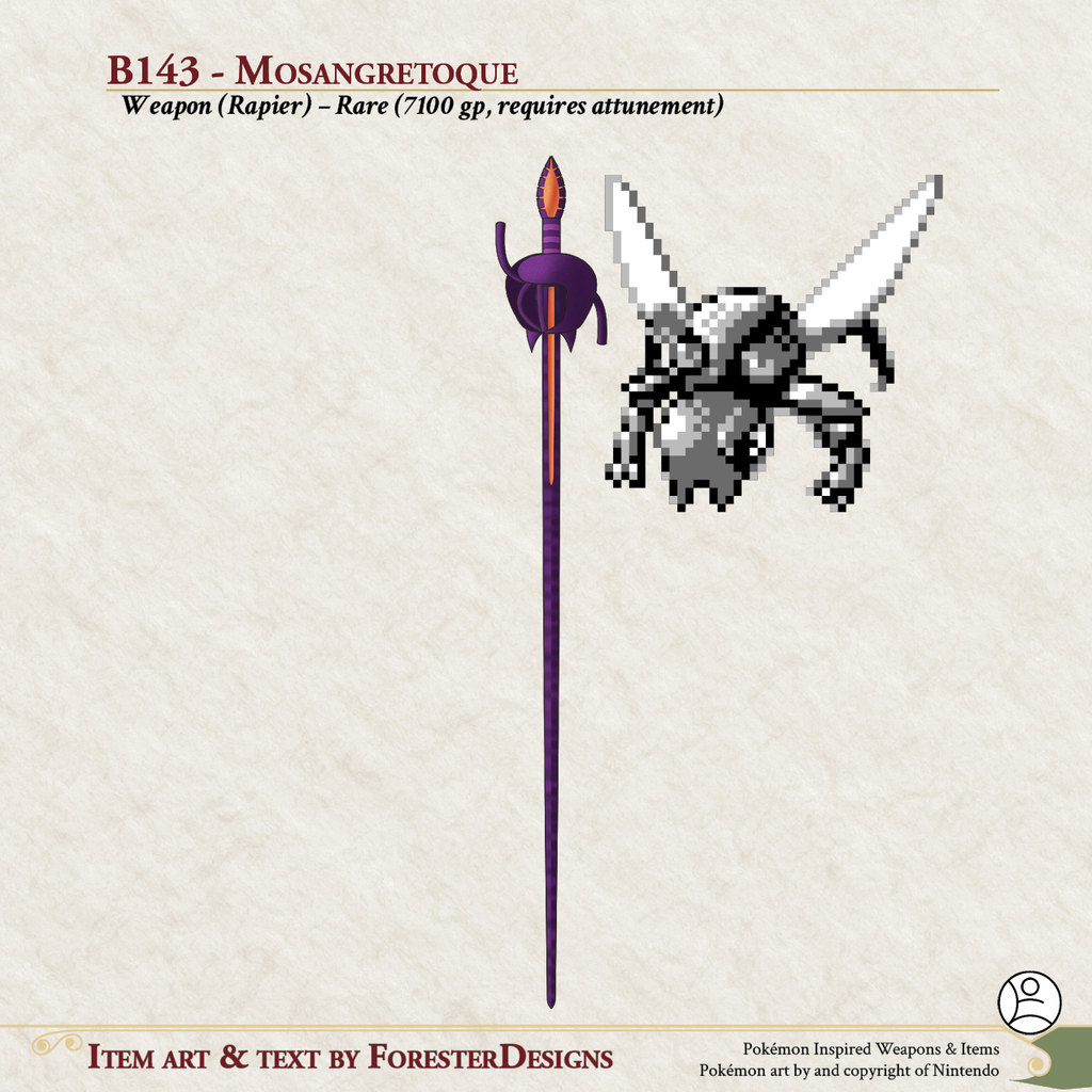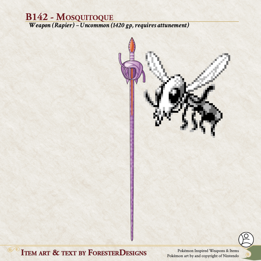 My #TTRPG #Pokemon #MagicItem of the Day in both #DnD and #PF2e, with a #Mosquito #rapier to find some blood to enjoy!