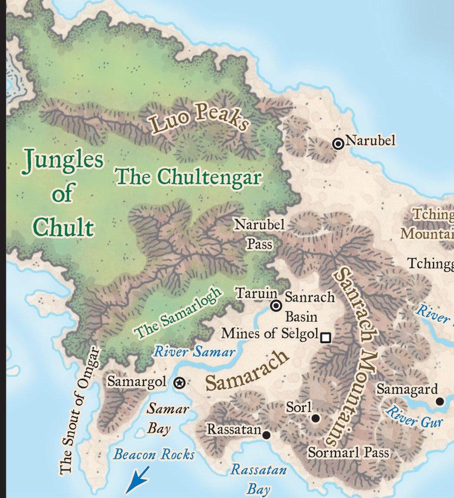 The nation of Samarach was incredibly difficult to get to. Surrounded by rugged mountains, the passes through the mountains and the roads to their cities were hidden behind illusions.#dnd: Serpent Kingdoms: Dennis Kauth, Robert Lazzarettihttps://forgottenrealms.fandom.com/wiki/Samarach