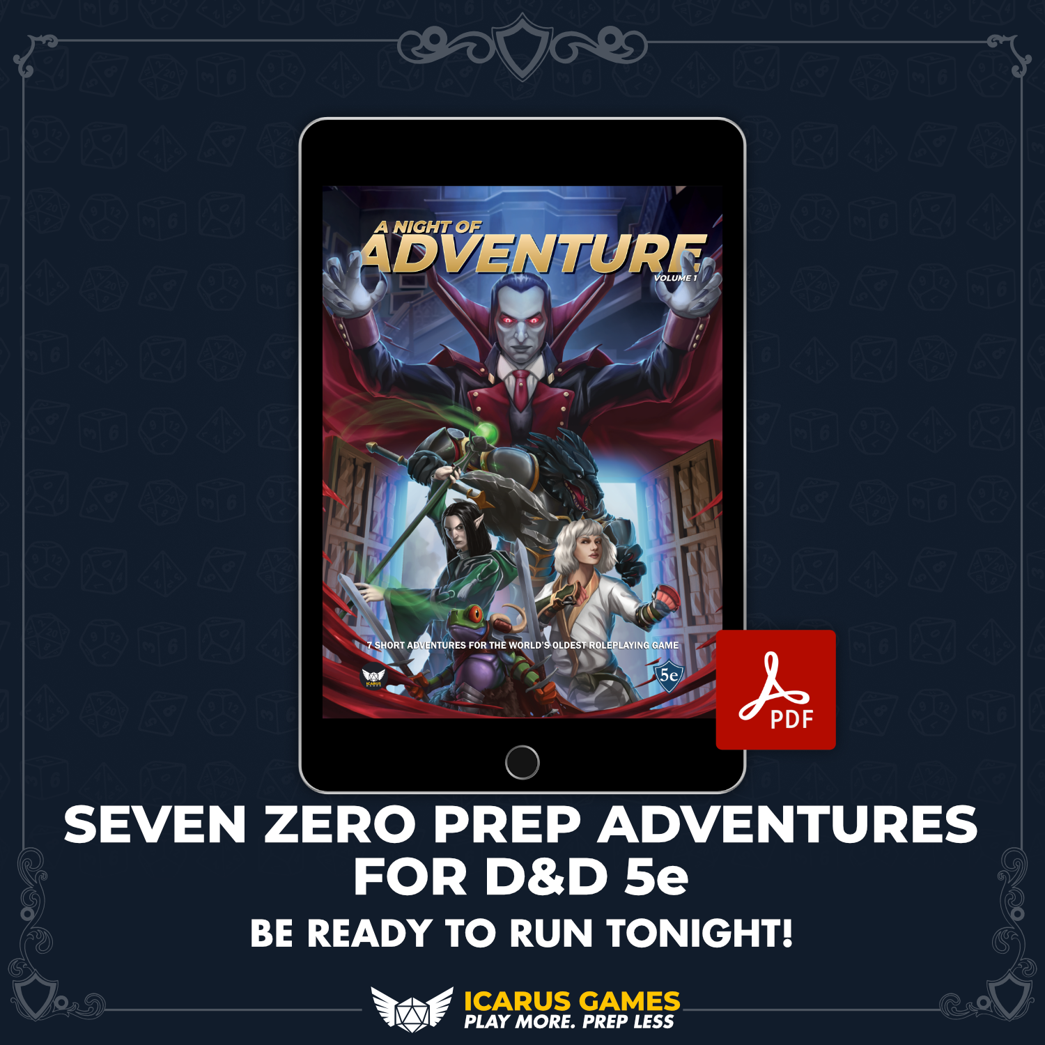 Get ready for A Night of Adventure, a collection of 7 short 5e adventures perfect for GMs with limited prep time. Each is packed with summaries, read-aloud boxes, reminder boxes, & notes to ensure a smooth & exciting intro to #DnD.Get your copy here: https://icarus-games.co.uk/products/a-night-of-adventure-vol-1