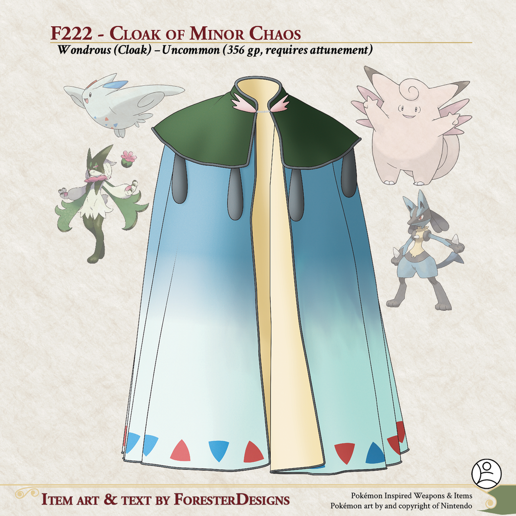 My #TTRPG #Pokemon #MagicItem of the Day in both #DnD and #PF2e, with #fusion of #Clefable, #Lucario, #Togekiss, and #Meowscarada for a #cloak to bring a little chaos to campaigns!