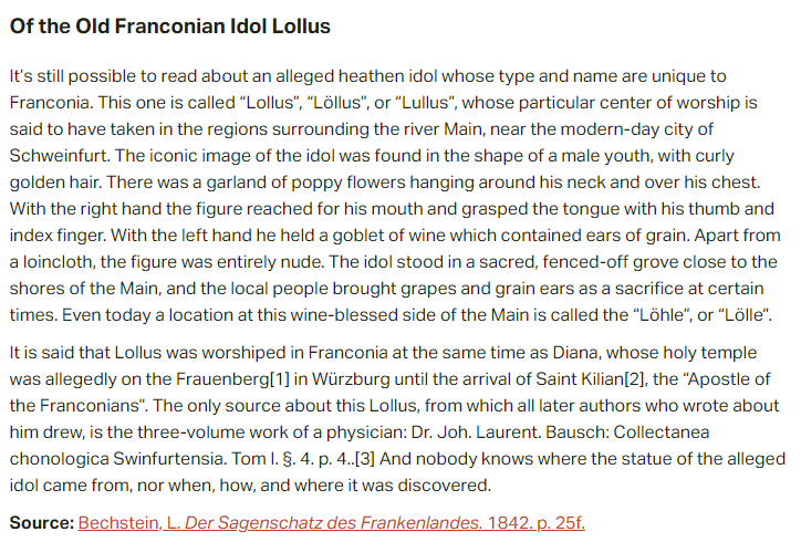 Lollus: A god worshipped by the pagans of old - or an overenthusiastic folklorist's flight of fancy?'n#Germany #folktale #folklore #paganism https://www.patreon.com/posts/with-old-gods-59551116