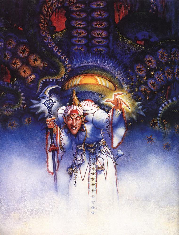 « The Revenge of the Wizard », c. 1985'nby Don Maitz (American artist, born 1953)Cover illustration for "Lone Wolf #3 The Caverns of Kalte", gamebook by Joe Dever, USA first Ed