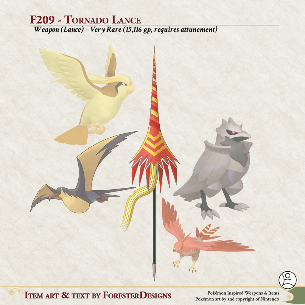 My #DnD #Pokemon #MagicItem of the Day, with a fusion of #Kilowattrel, #Talonflame, #Corviknight, and #Pidgeot for a #lance of pyrovoltaic pressure