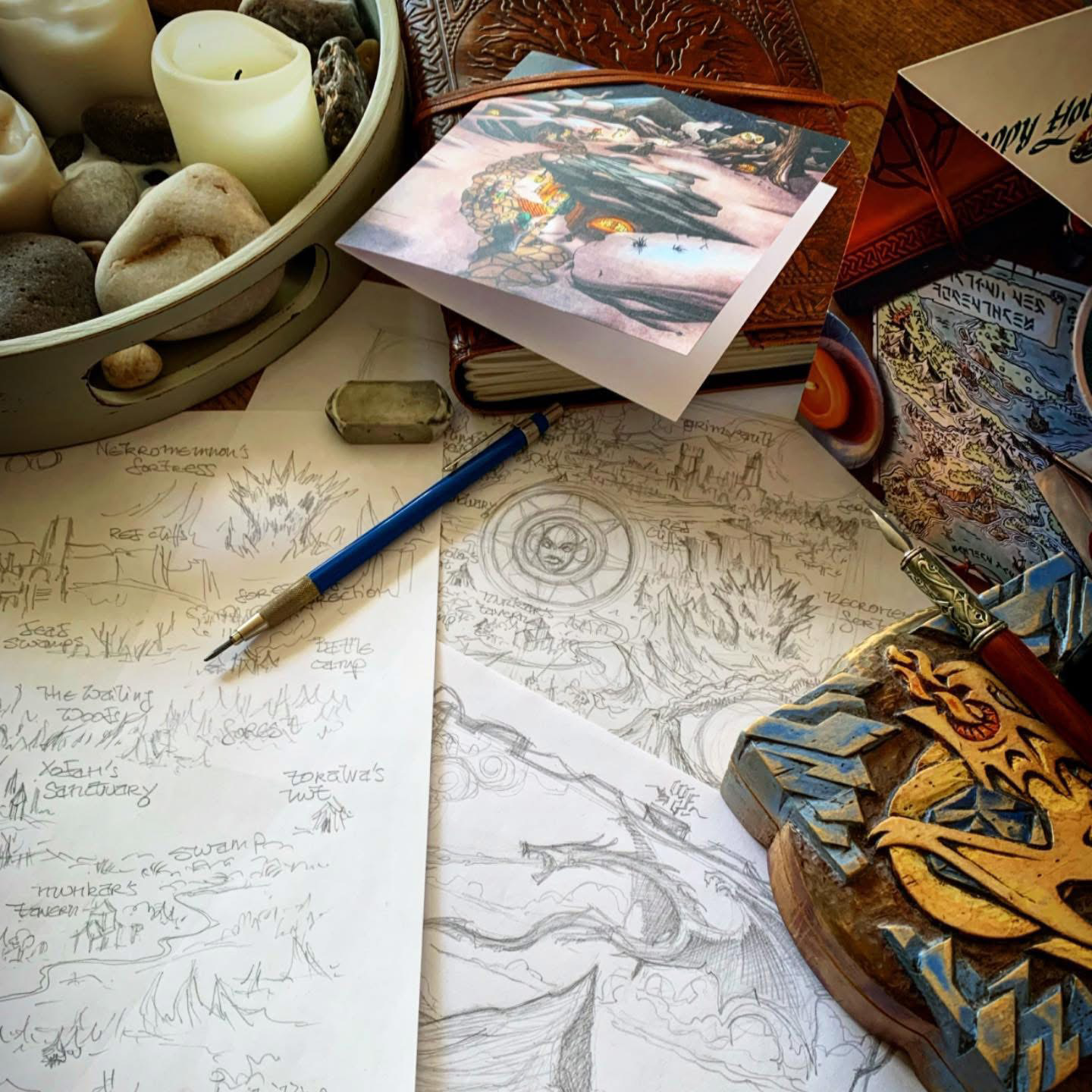 Writing holiday cards (with art by yours truly) and doodling for some fun side quests including a map with a dragon above a lonely mountain and a tribute fan art map to the most excellent and ridiculously fun #Deathstalker reboot!