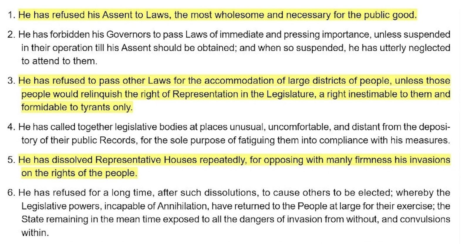 Stephen Wolf:The Declaration of Independence specifies 27 grievances with King George III and Britain.
