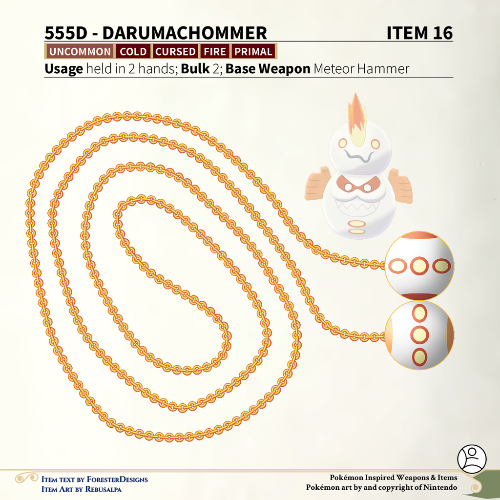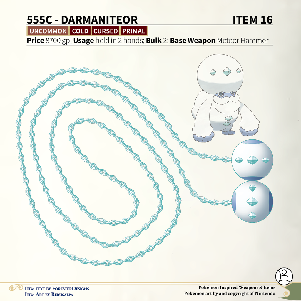 A #PF2e conversion of my older #Pokemon #MagicItems, with a Galarian #Darmanitan #meteorhammer to flip hot and cold