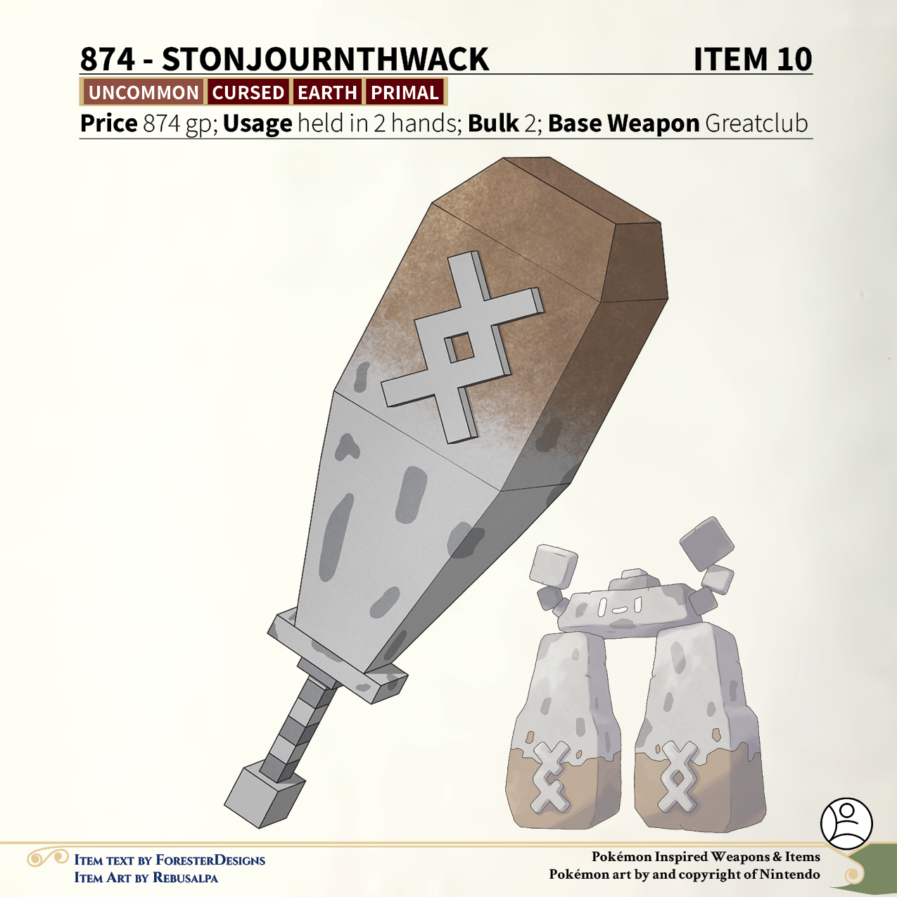 A #PF2e conversion of my older #Pokemon #MagicItems, with a #Stonjourner #greatclub to enjoy powerful spots