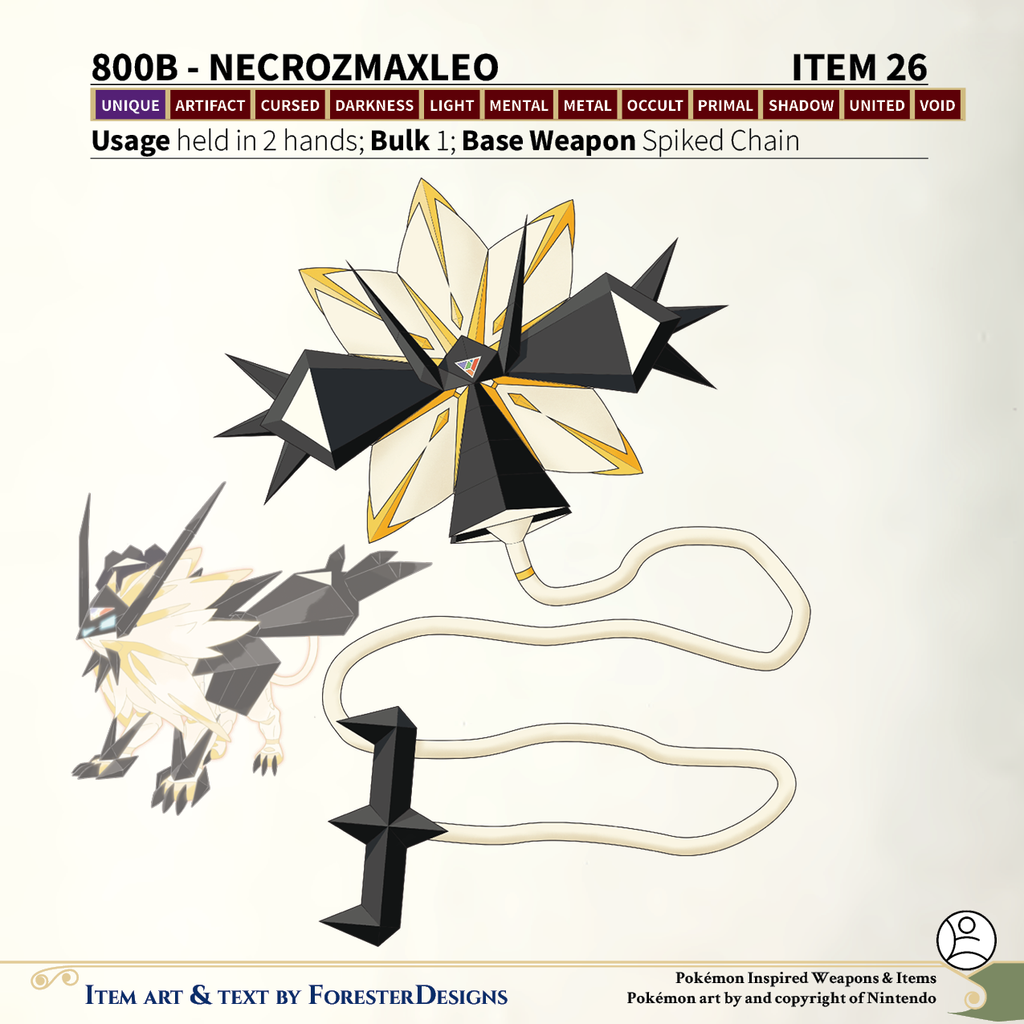 A #PF2e conversion of my older #Pokemon #MagicItems, with a Dusk Mane #Necrozma #spikedchain to devour the light