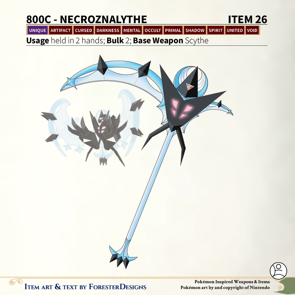 A #PF2e conversion of my older #Pokemon #MagicItems, with a Dawn Wings #Necrozma #scythe to devour the light