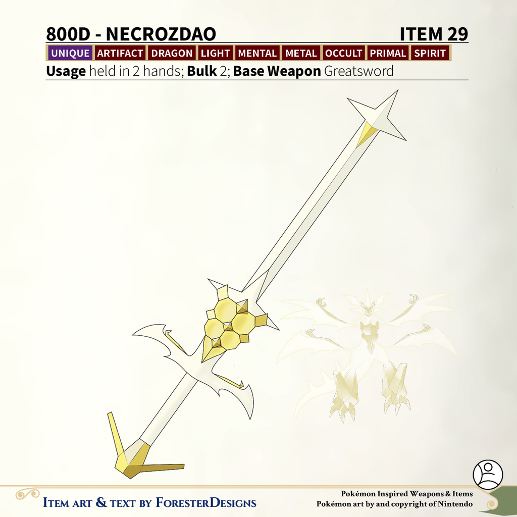 A #PF2e conversion of my older #Pokemon #MagicItems, with an Ultra #Necrozma #greatsword to shine brighter than the sun
