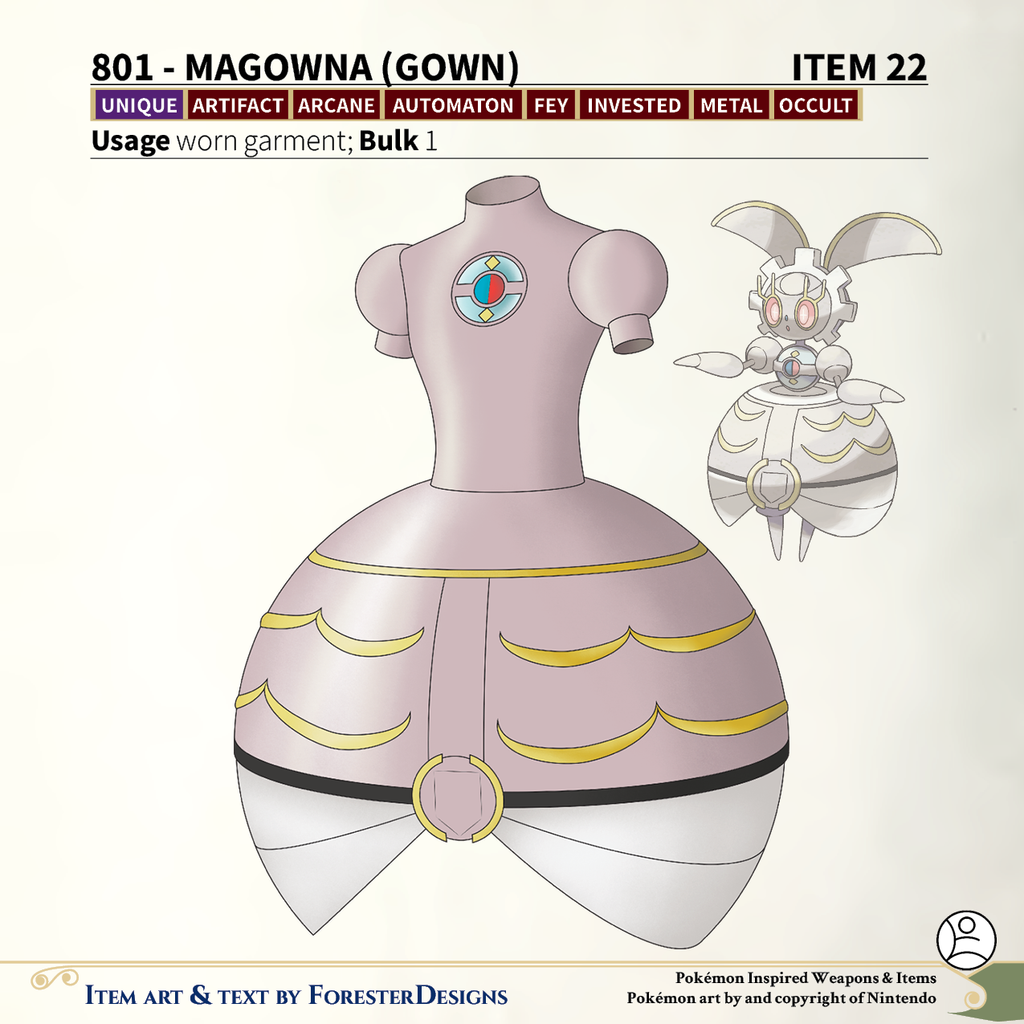 A #PF2e conversion of my older #Pokemon #MagicItems, with a #Magearna #gown to automate yourself into a sphere