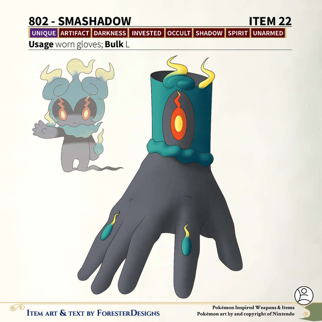 A #PF2e conversion of my older #Pokemon #MagicItems, with some #Marshadow #gloves to shadow box