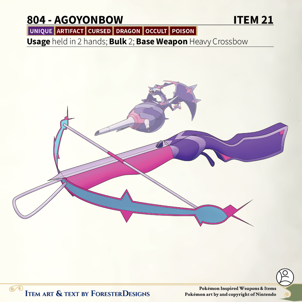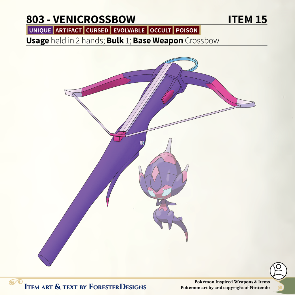 A #PF2e conversion of my older #Pokemon #MagicItems, with a #Naganadel heavy #crossbow of glowing poison
