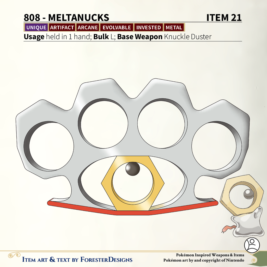 A #PF2e conversion of my older #Pokemon #MagicItems, with a #Meltan #knuckleduster to corrode other metals