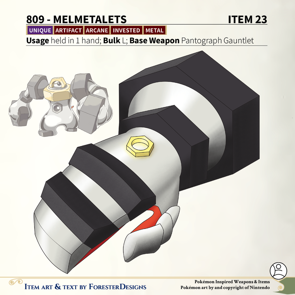 A #PF2e conversion of my older #Pokemon #MagicItems, with a #Melmetal pantograph #gauntlet to corrode other metals