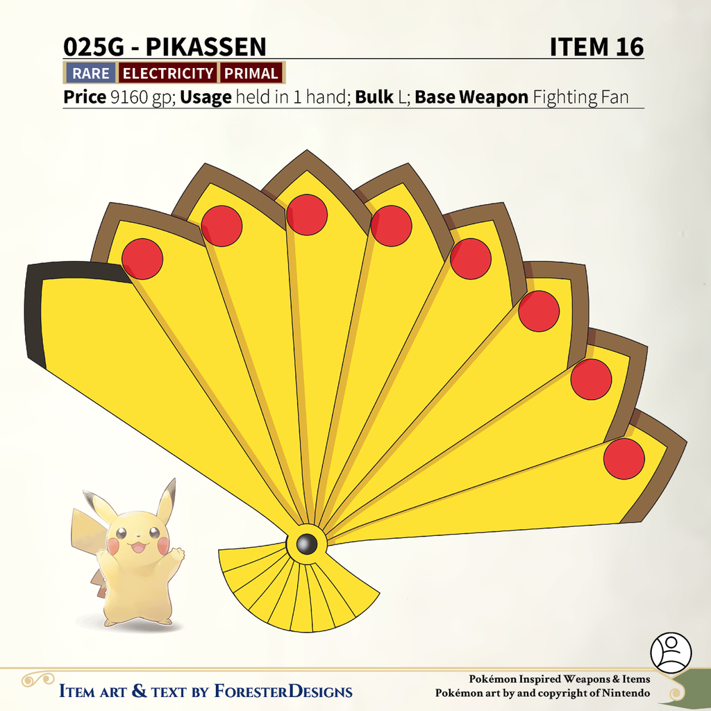 A #PF2e conversion of my older #Pokemon #MagicItems, with a Partner #Pikachu #fightingfan to draw the lightning