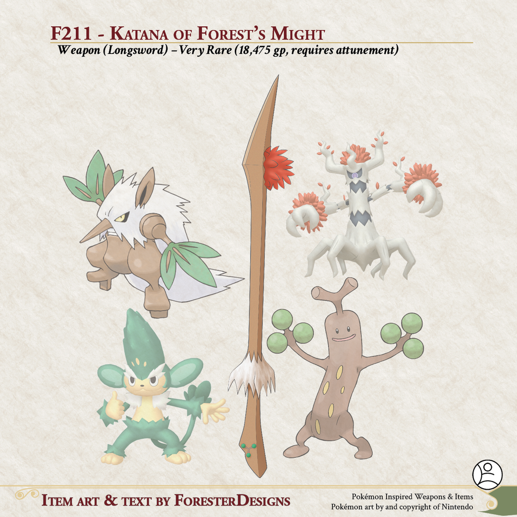 My #DnD #Pokemon #MagicItem of the Day, with a fusion of #Simisage, #Sudowoodo, #Trevenant, and #Shiftry for a #katana to channel the might of the forest
