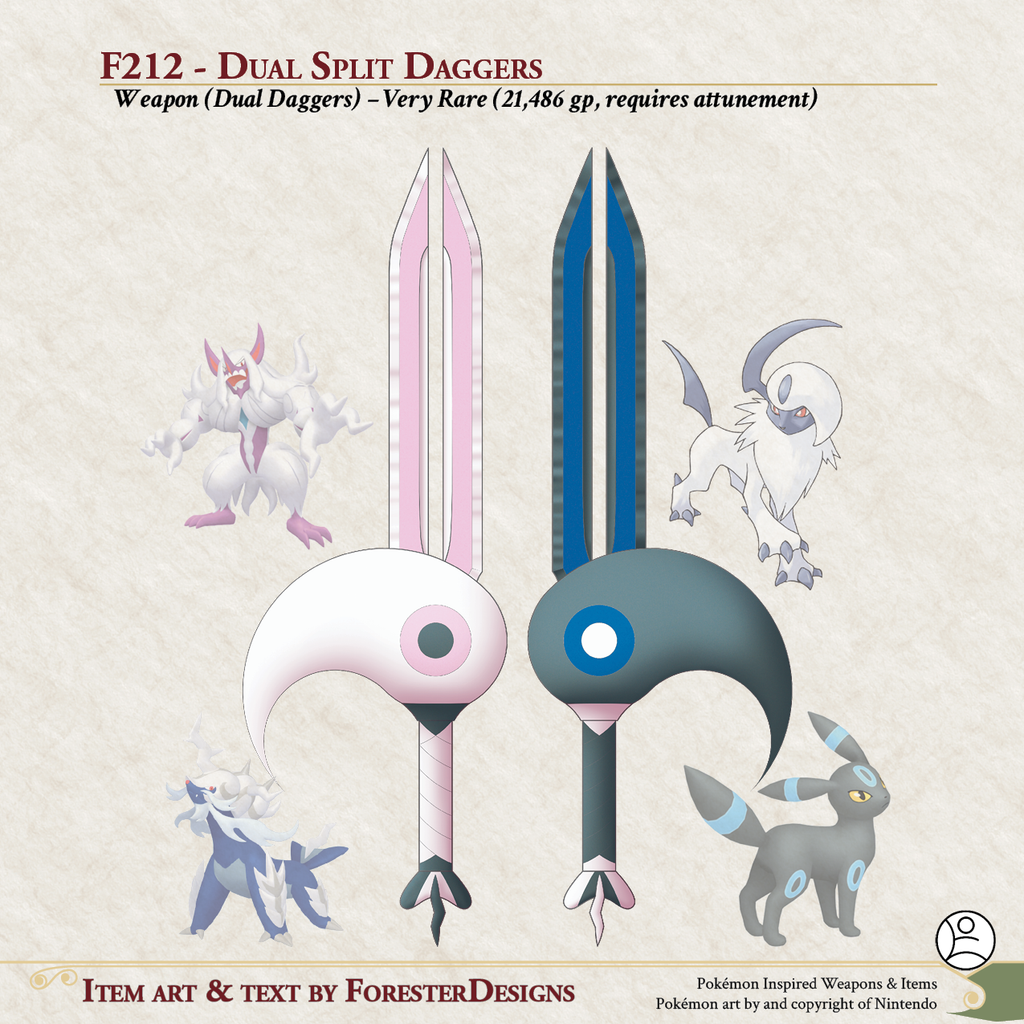 My #DnD #Pokemon #MagicItem of the Day, with a fusion of #Absol, #Umbreon, #Grimmsnarl, and #Husian #Samurot for a pair of #daggers to balance the good and the bad