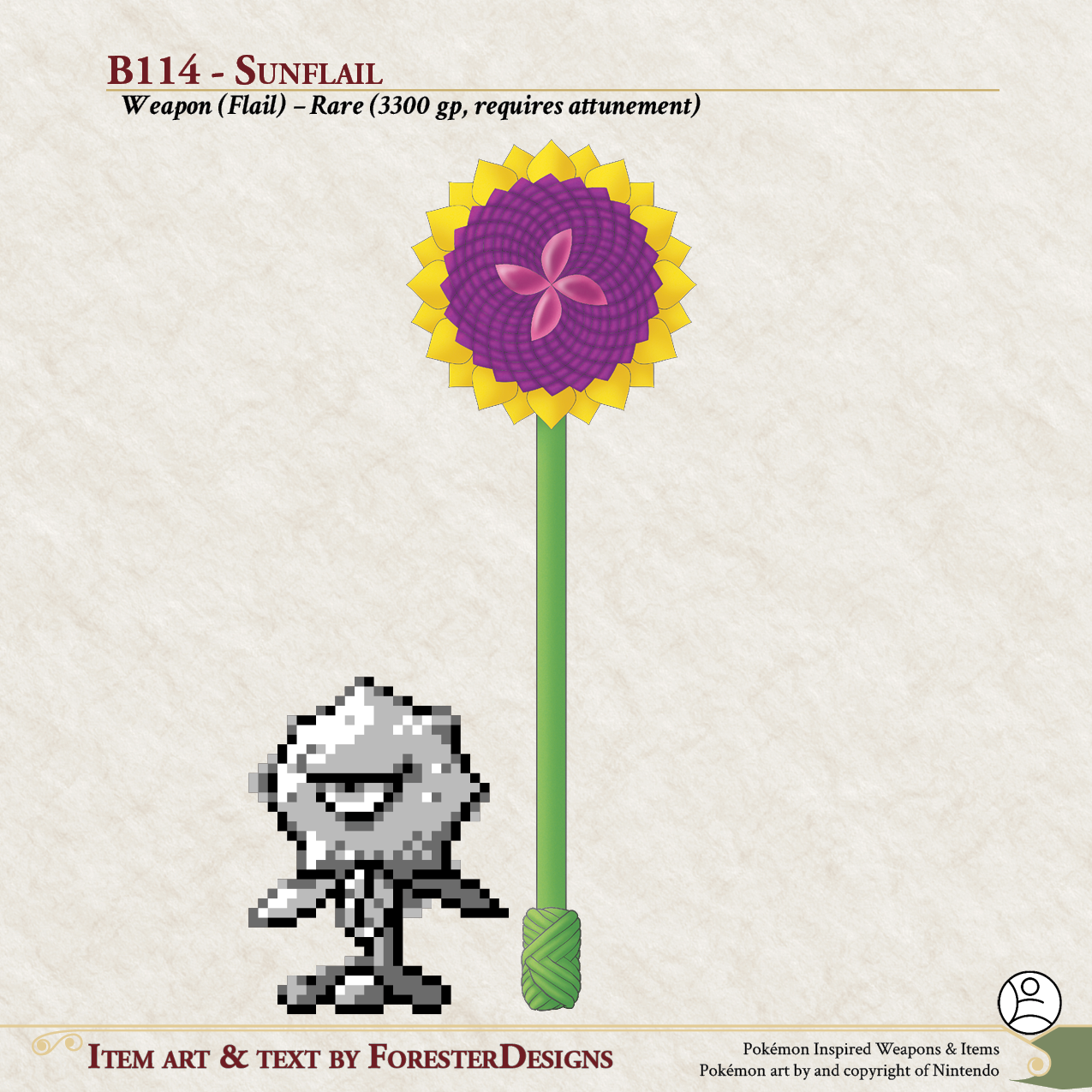 My #TTRPG #Pokemon #MagicItem of the Day in both #DnD and #PF2e, with a Beta #Sunflora #flail to give your enemies headaches!