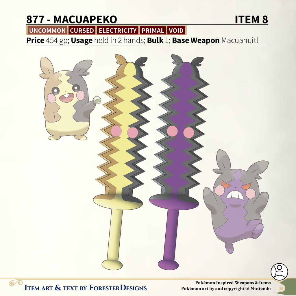 A #PF2e conversion of my older #Pokemon #MagicItems, with a #Morpeko #macuahuitl to get you running
