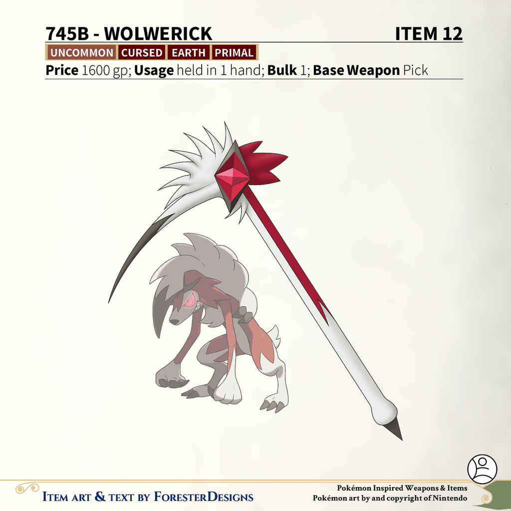 A #PF2e conversion of my older #Pokemon #MagicItems, with a #Lycanroc #pick to attack wildly!Come vote for future items on my Patreon#MagicItem #Pathfinder2e #RPG #RPGArt #PokemonArt #Pathfinder #TTRPG #PathfinderArt #Illustration #FantasyArt #TabletopRPG #PokemonFanArt #Homebrew #FantasyIllustration #TabletopGaming #FantasyGaming #RolePlayingGames #TabletopArt #GameMaster #FantasyWorld #HomebrewContent #GameDesign #MagicItemDesign #PathfinderCommunity #PathfinderHomebrew #HomebrewMagic