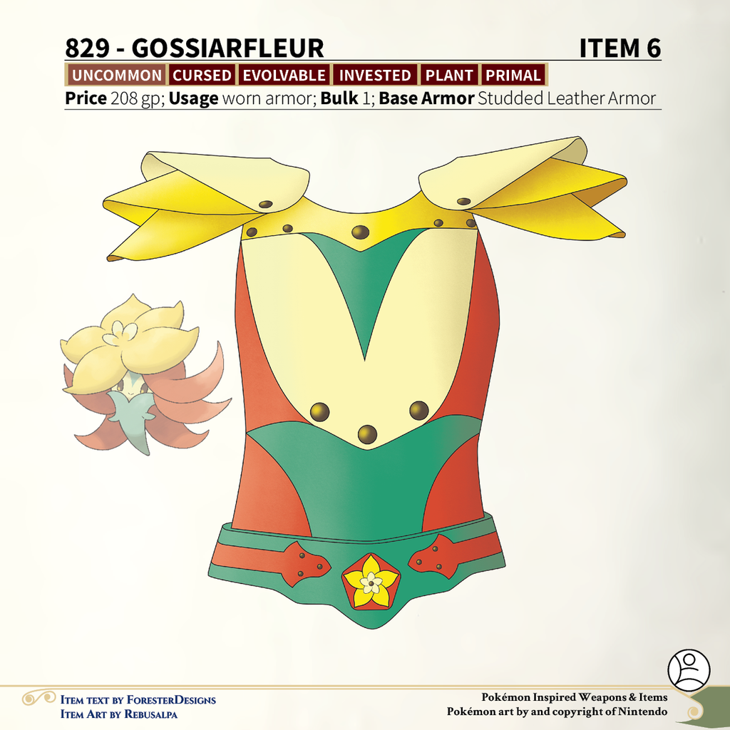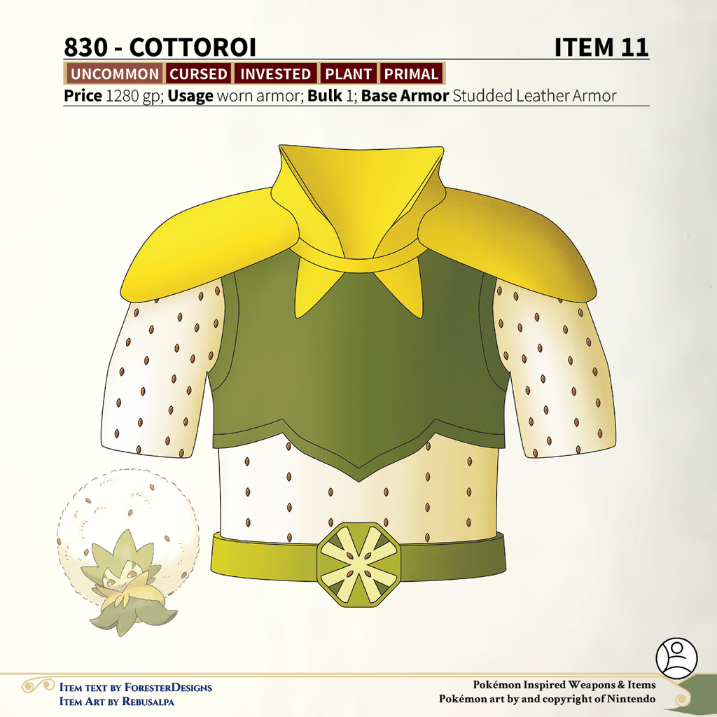 A #PF2e conversion of my older #Pokemon #MagicItems, with some #Gossifleur studded leather #armor to spread some cotton!Come vote for future items on my Patreon#MagicItem #Pathfinder2e #RPG #RPGArt #PokemonArt #Pathfinder #TTRPG #PathfinderArt #Illustration #FantasyArt #TabletopRPG #PokemonFanArt #FantasyIllustration #Homebrew #TabletopGaming #FantasyGaming #RolePlayingGames #TabletopArt #GameMaster #FantasyWorld #HomebrewContent #GameDesign #MagicItemDesign #PathfinderCommunity