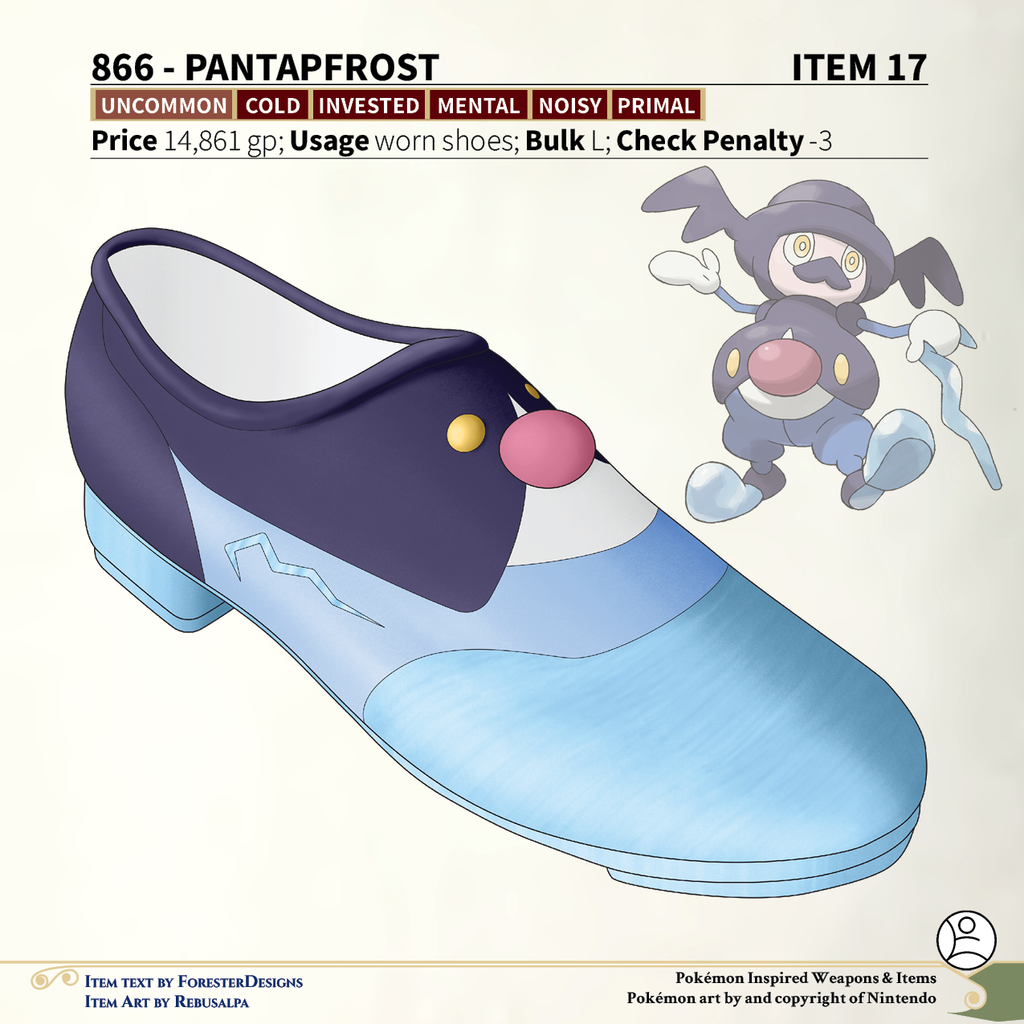A #PF2e conversion of my older #Pokemon #MagicItems, with some #MrRime #shoes to freeze the dance floor, & some Galarian #Yamask niyaháat #armor to make items' magic wander!