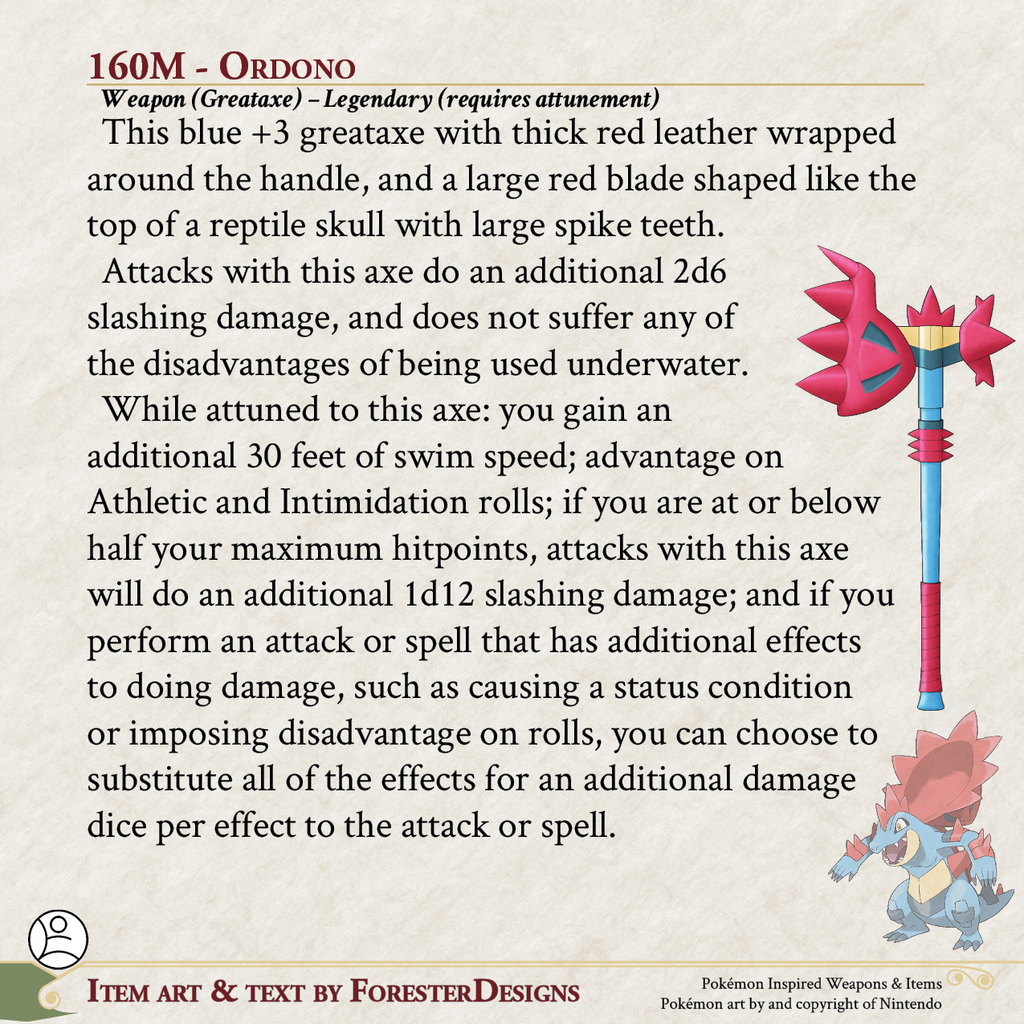 My #TTRPG #Pokemon #MagicItem of the Day in both #DnD and #PF2e, with a Mega #Feraligatr #axe to take a big bite out of your enemies!