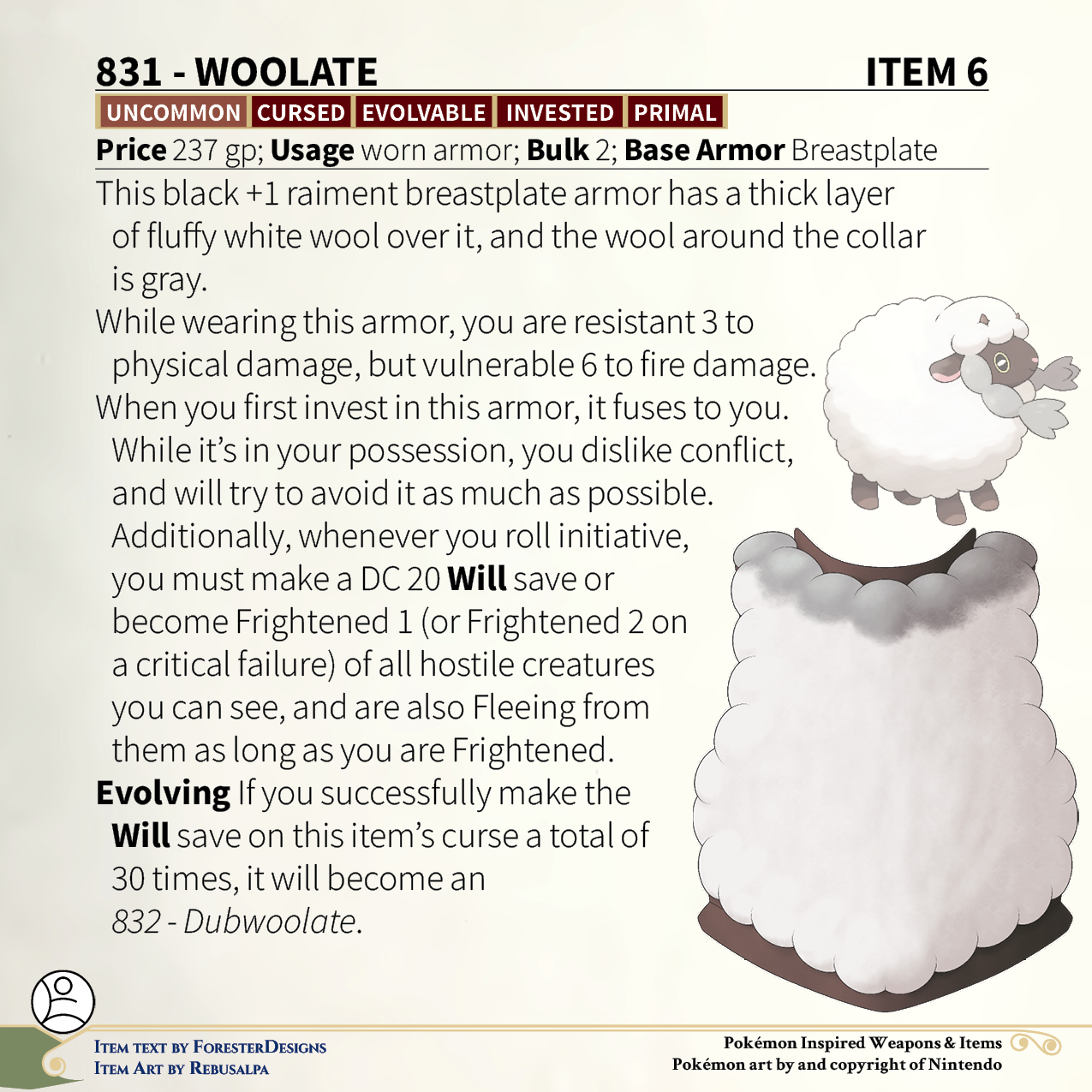 A #PF2e conversion of my older #Pokemon #MagicItems, with some #Wooloo breastplate #armor to give you a fleeing fleece!