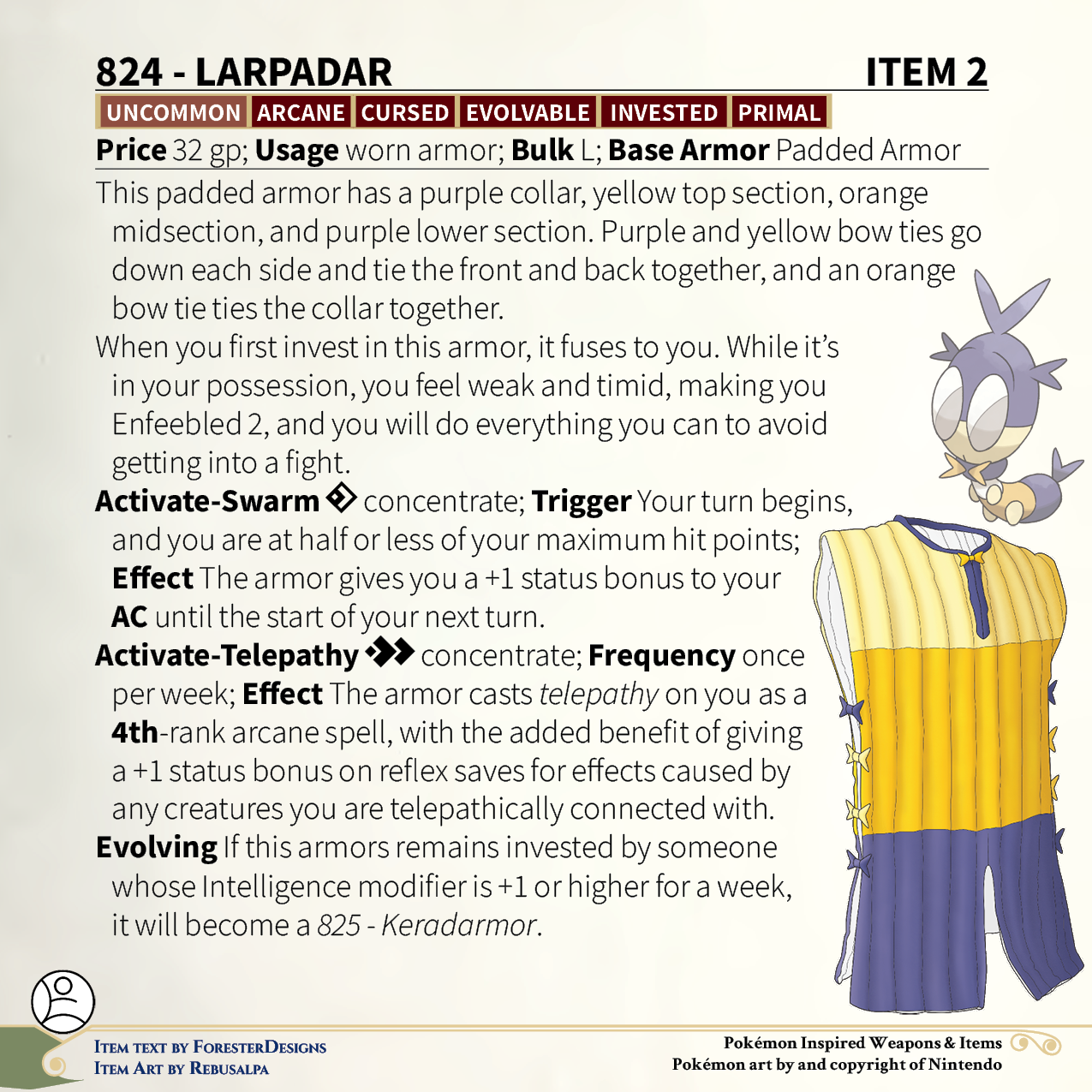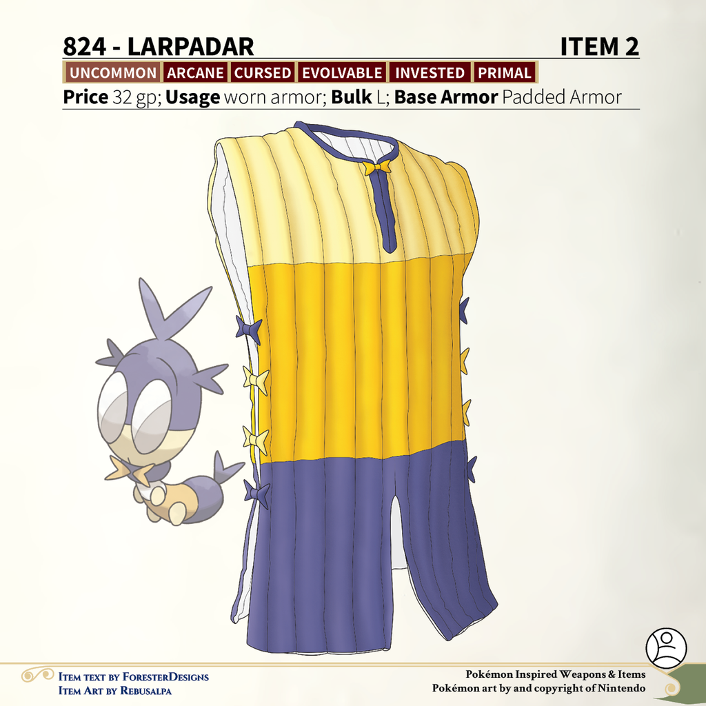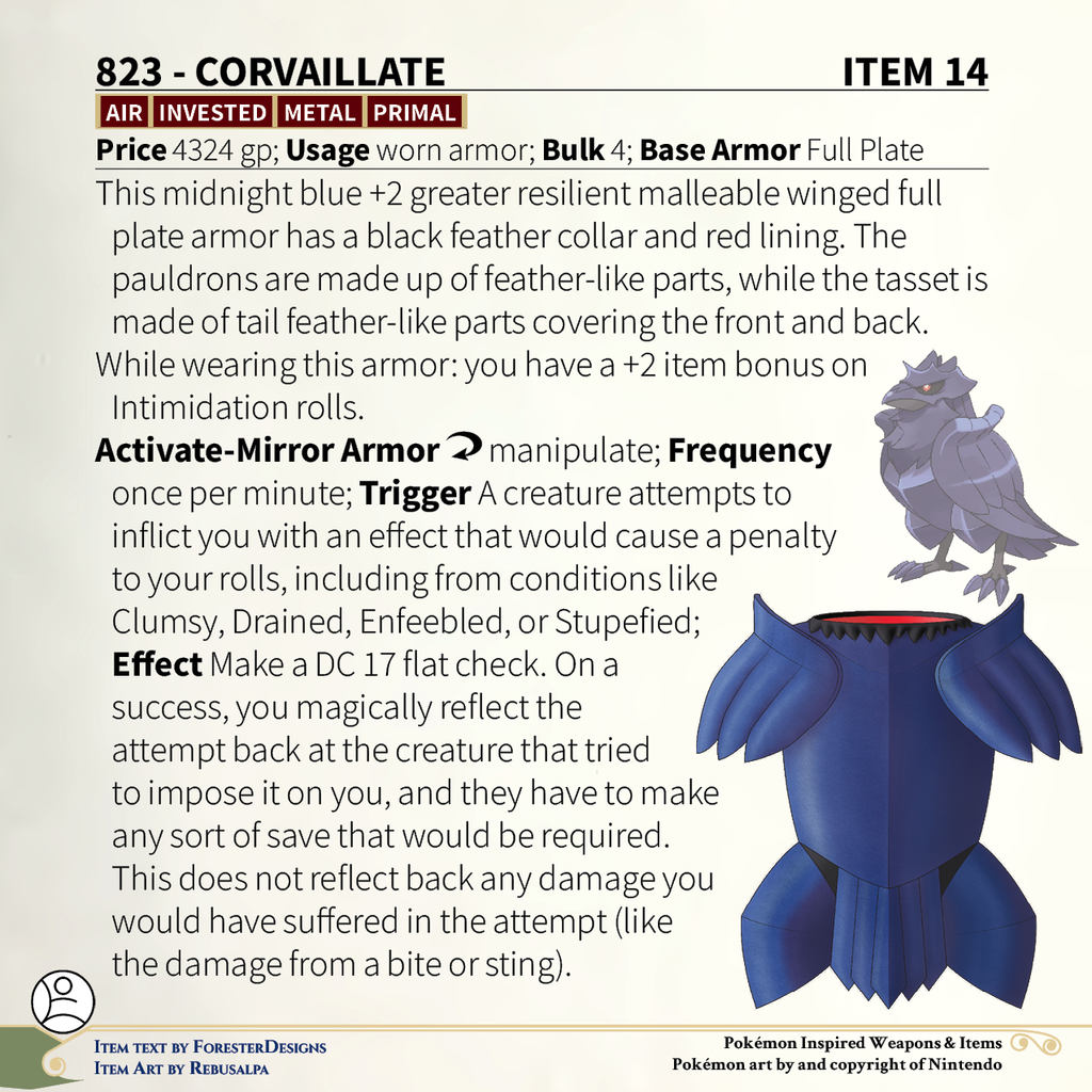 A #PF2e conversion of my older #Pokemon #MagicItems, with some #Corviknight plate #armor to reflect penalties back at their source, & some #Blipbug padded #armor to be of strong mind but weak body