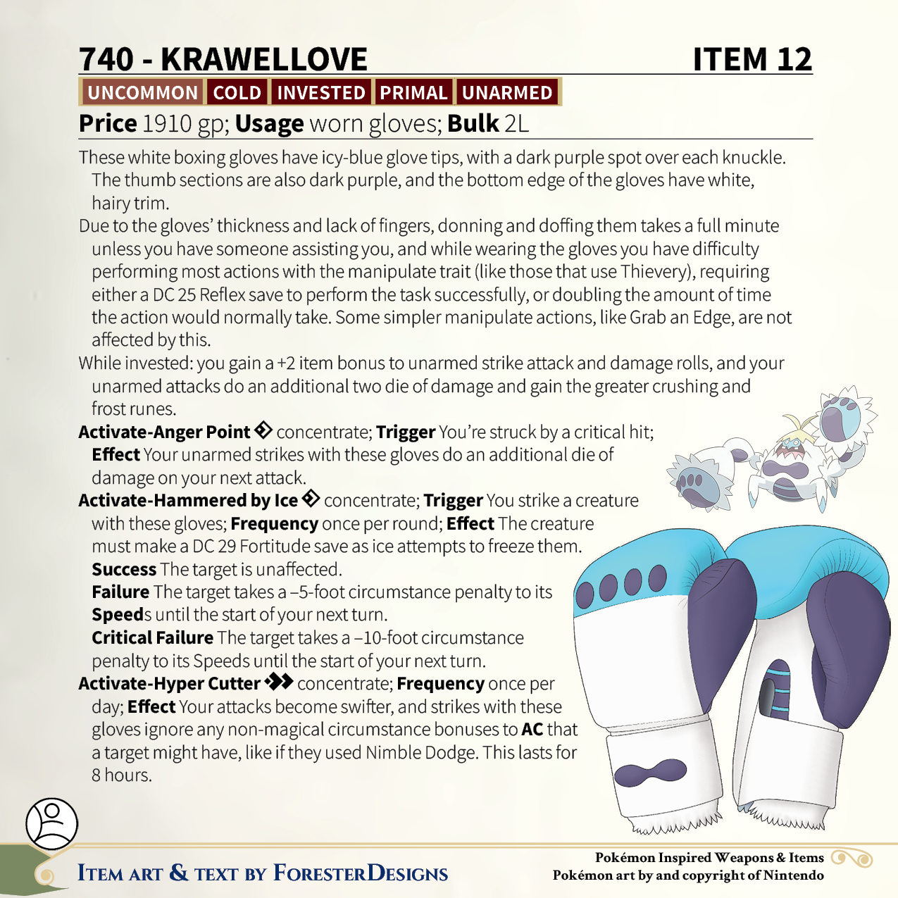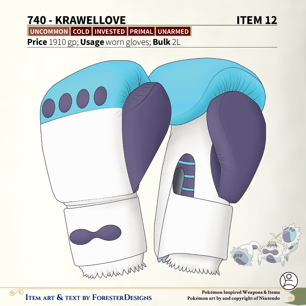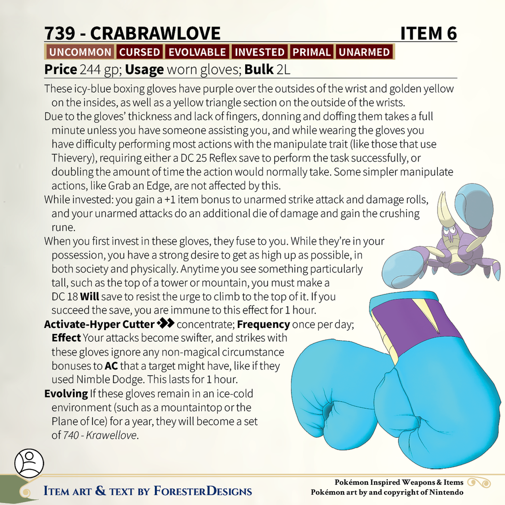 A #PF2e conversion of my older #Pokemon #MagicItems, with some #Crabrawler & #Crabominable #boxing #gloves to help you punch down!