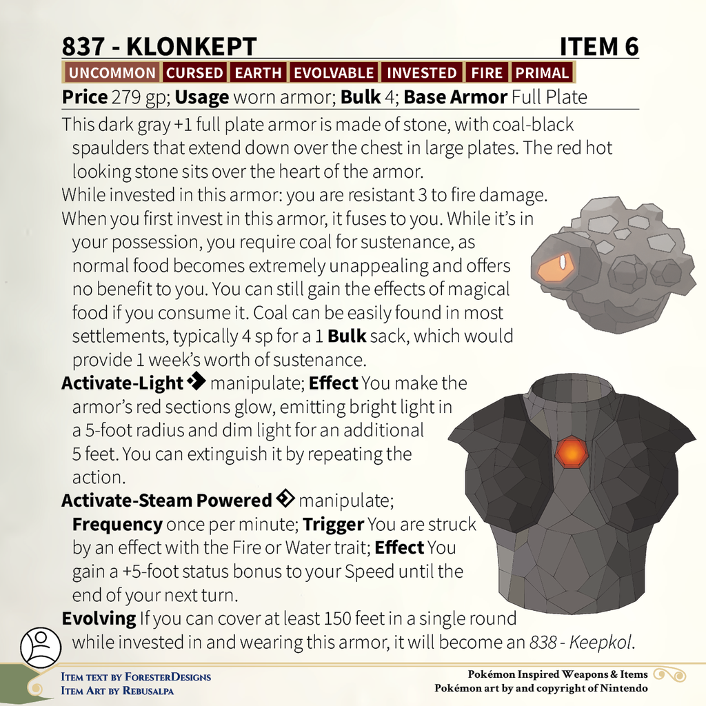 A #PF2e conversion of my older #Pokemon #MagicItems, with some #Rolycoly full #plate #armor to get you rolling!