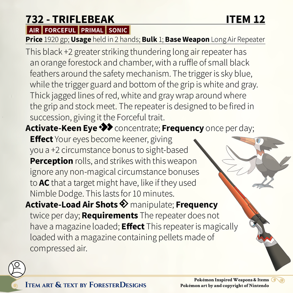 A #PF2e conversion of my older #Pokemon #MagicItems, with a #Trumbeak long #airrepeater to keep up the suppressing fire!