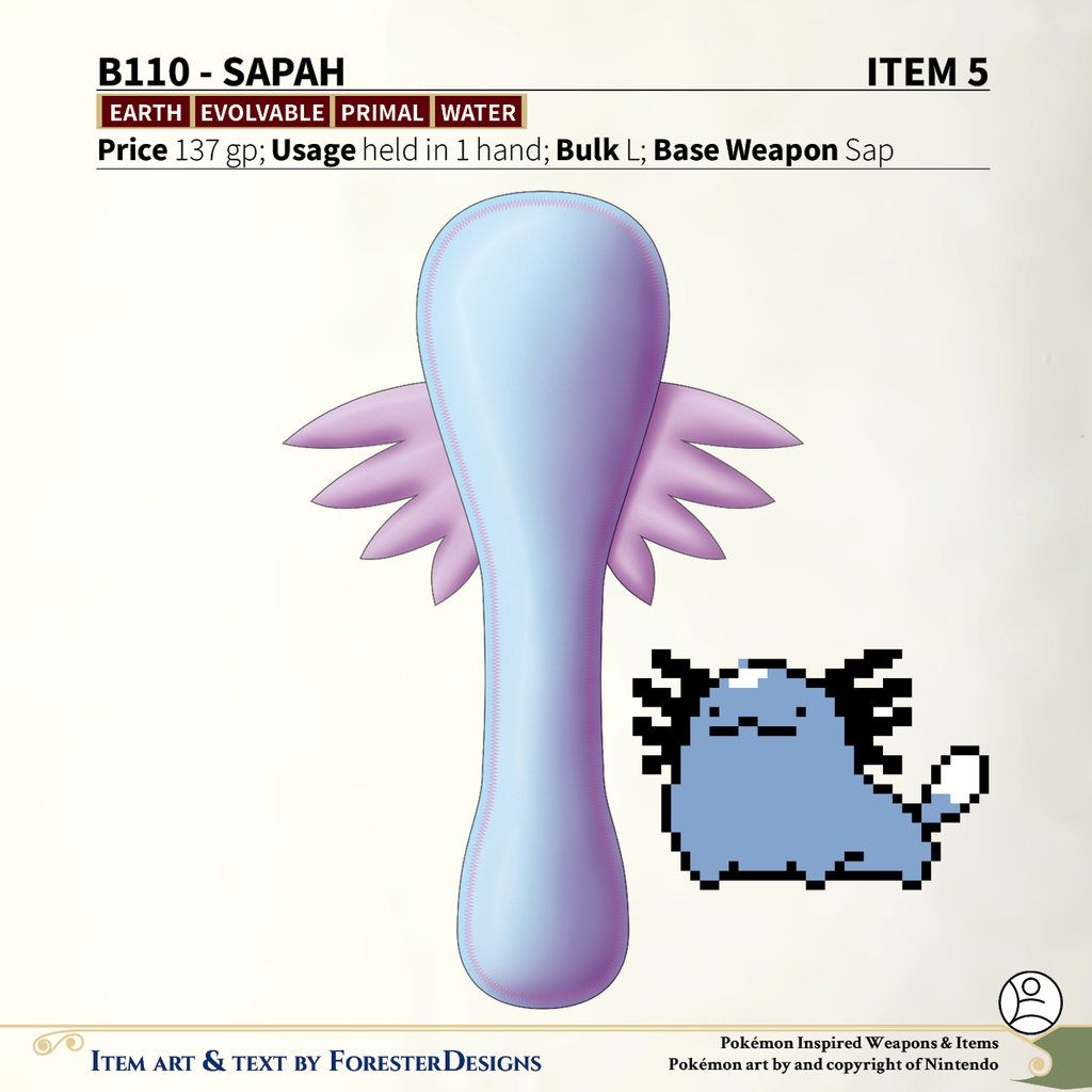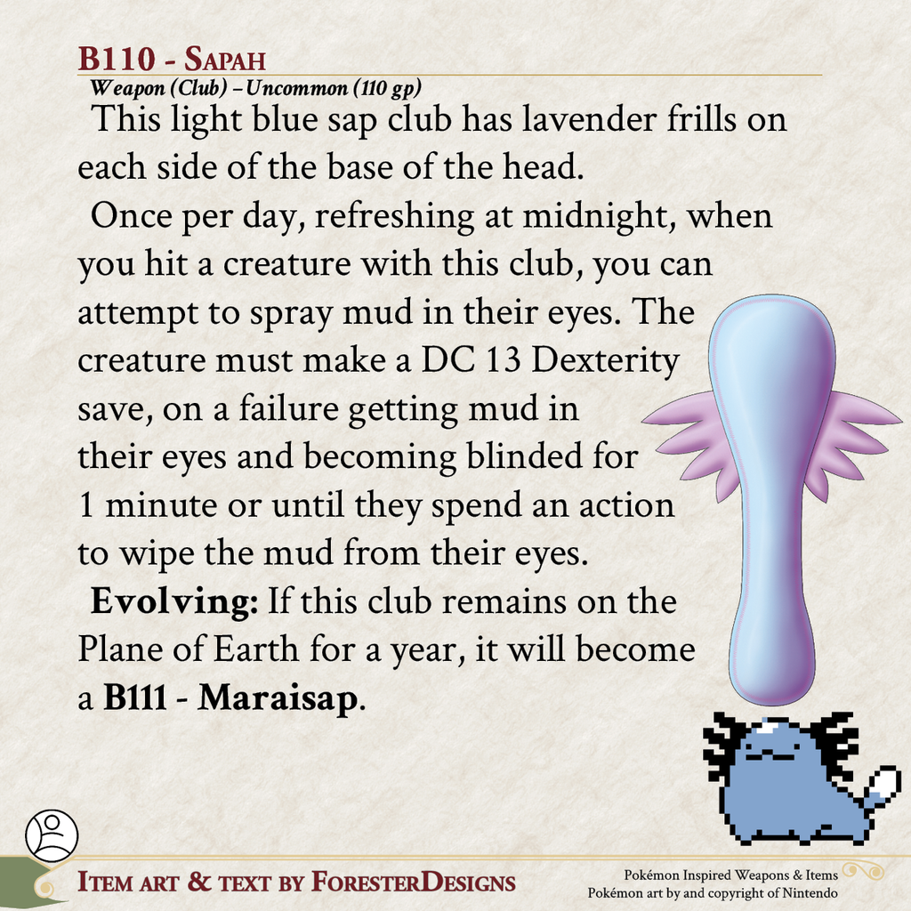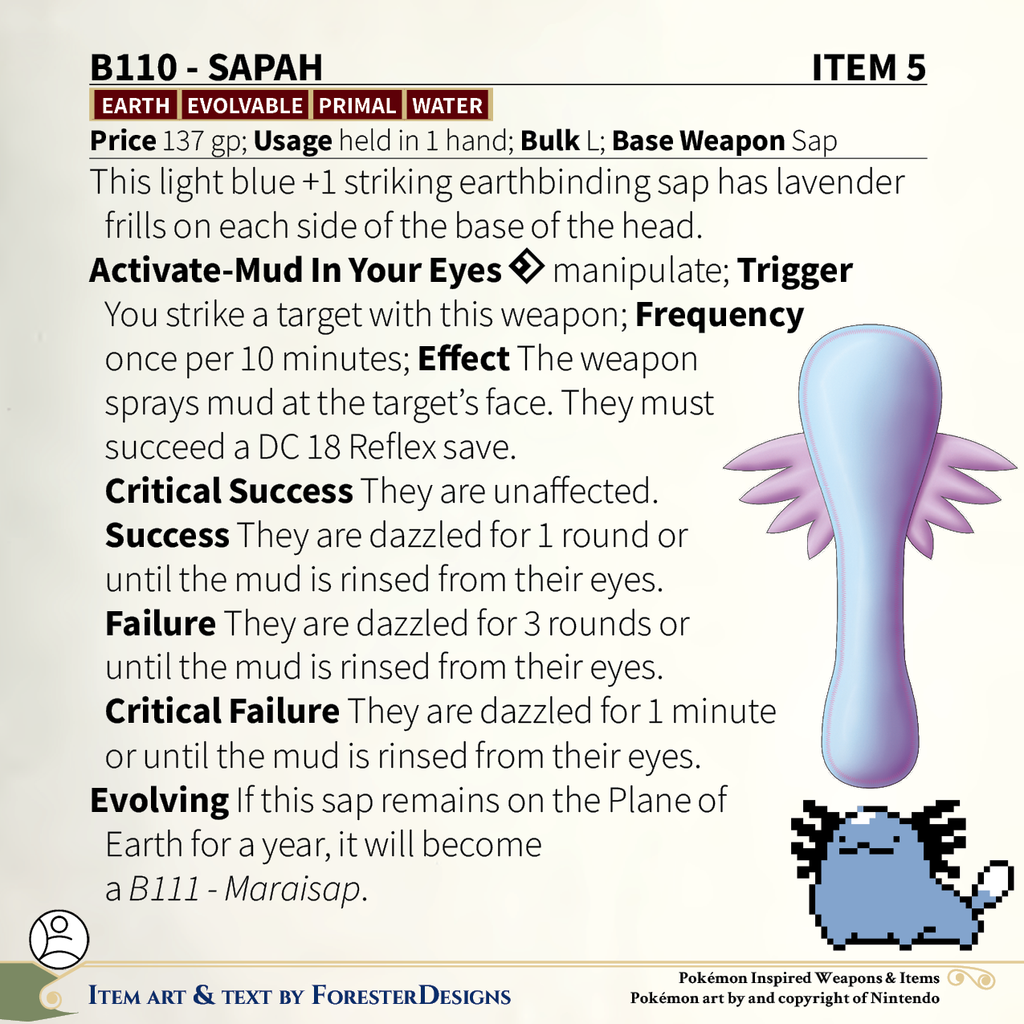 My #TTRPG #Pokemon #MagicItem of the Day in both #DnD and #PF2e, with a Beta #Wooper #sap to spray mud in your enemies eyes!