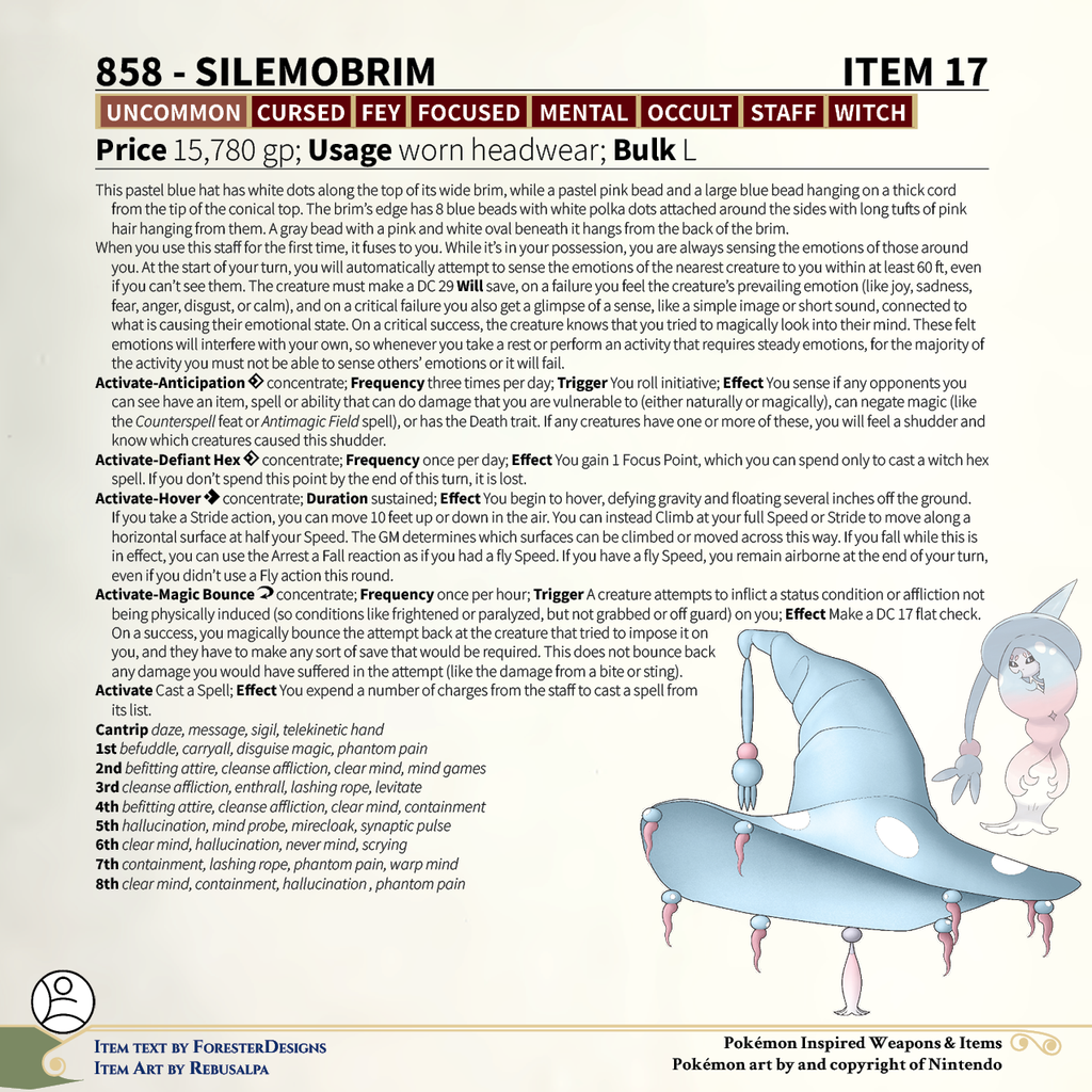 A #PF2e conversion of my older #Pokemon #MagicItems, with a #Hatterene #hat to channel some emotional witch magic