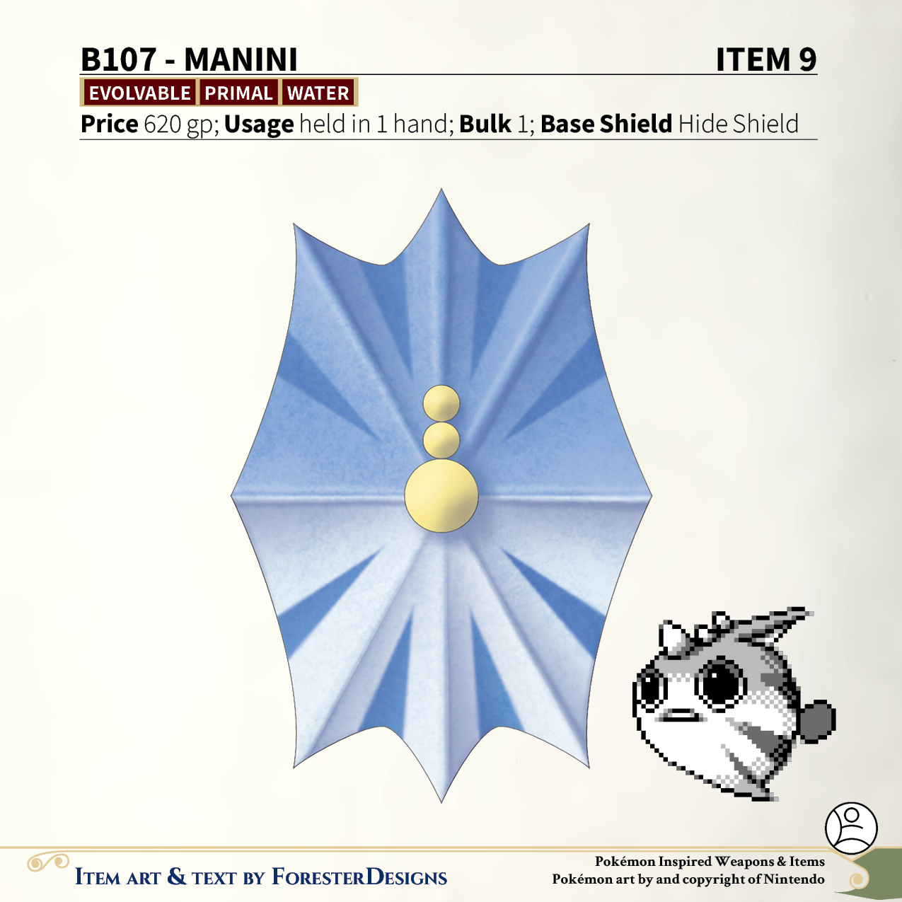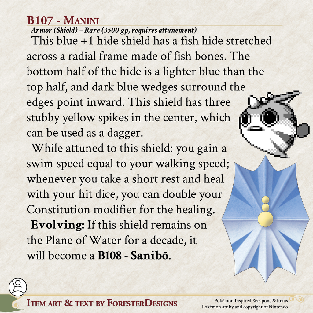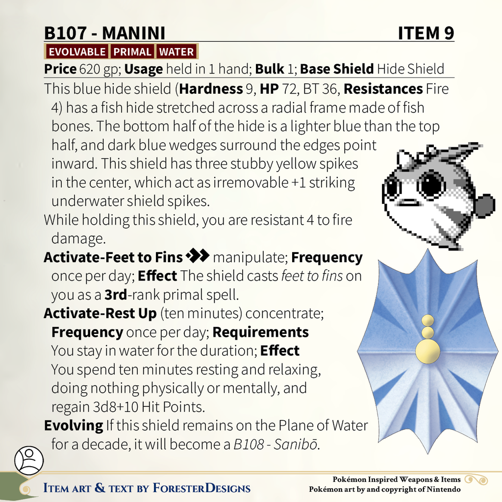 My #TTRPG #Pokemon #MagicItem of the Day in both #DnD and #PF2e, with a #Manbō2 #shield to swim into your problems!