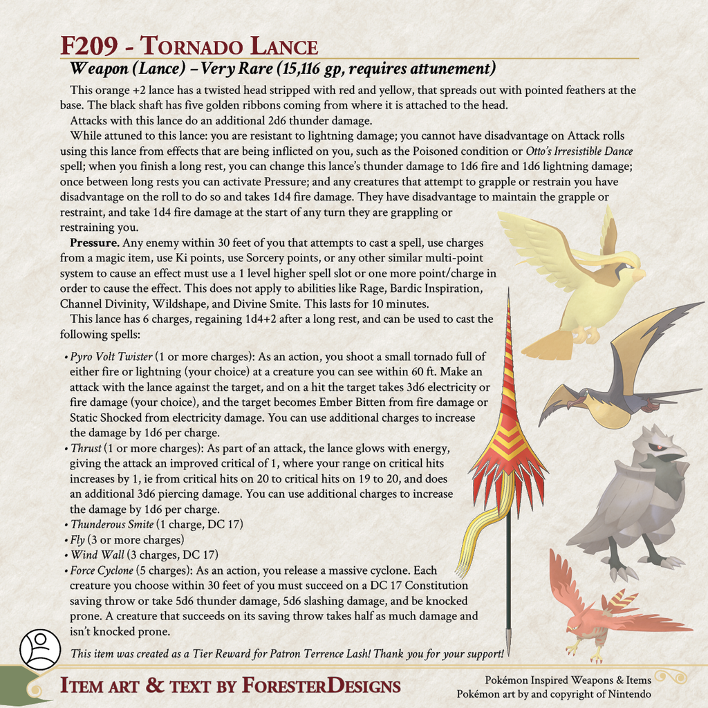 My #DnD #Pokemon #MagicItem of the Day, with a fusion of #Kilowattrel, #Talonflame, #Corviknight, and #Pidgeot for a #lance of pyrovoltaic pressure!