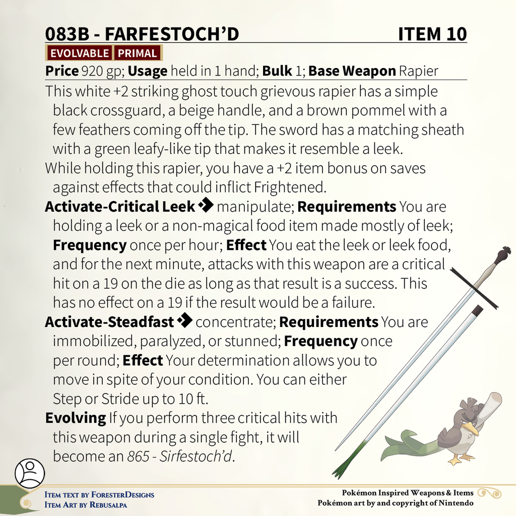 A #PF2e conversion of my older #Pokemon #MagicItems, with a Galarian #Farfetchd #rapier to get some critical leeks!