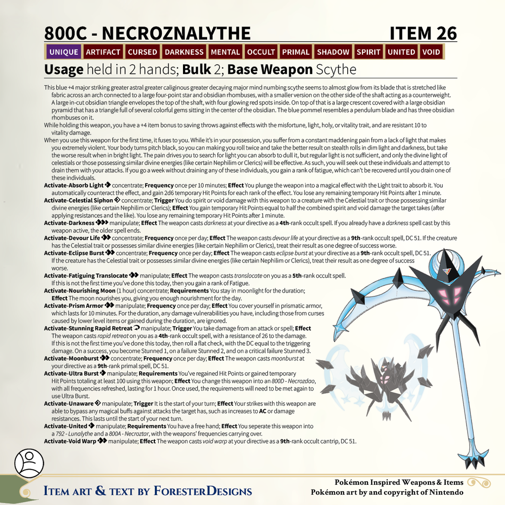 A #PF2e conversion of my older #Pokemon #MagicItems, with a Dawn Wings #Necrozma #scythe to devour the light!