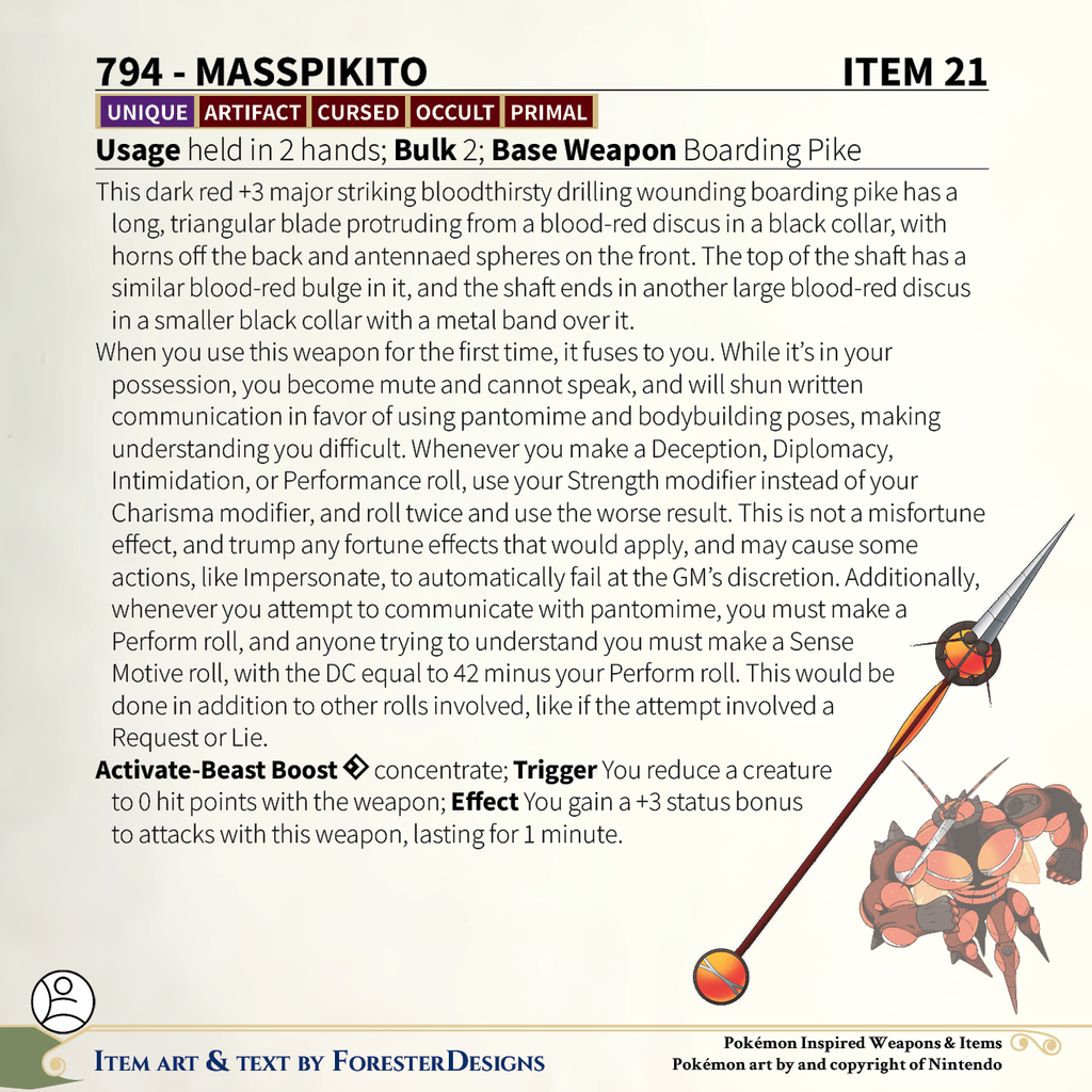 A #PF2e conversion of my older #Pokemon #MagicItems, with a #Buzzwole boarding #pike to suck your enemies dry!