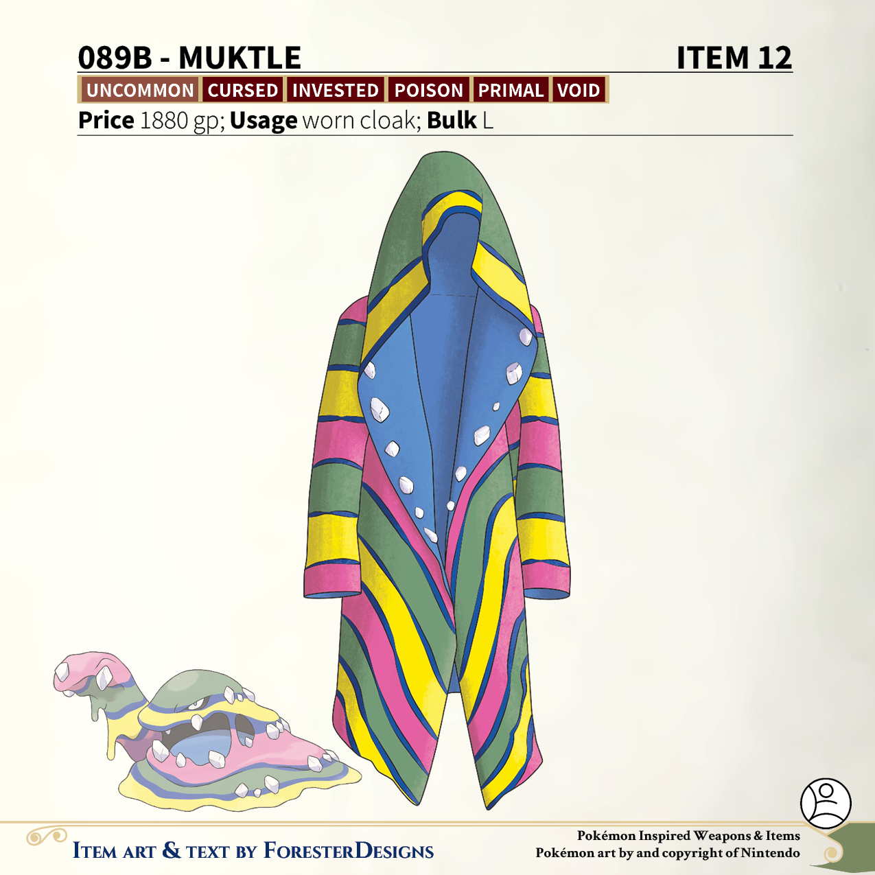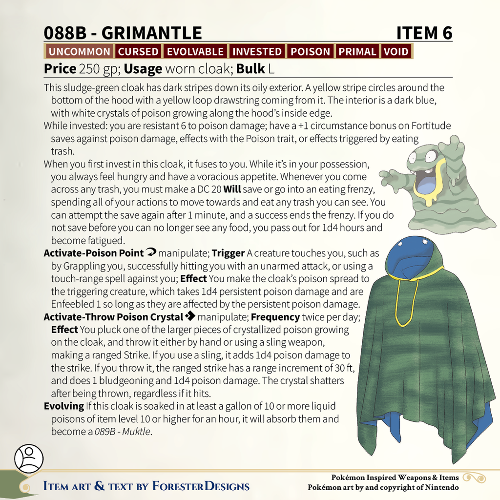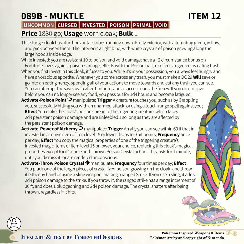 A #PF2e conversion of my older #Pokemon #MagicItems, with some #Alolan #Grimer & Alolan #Muk #cloaks to throw some poison around!