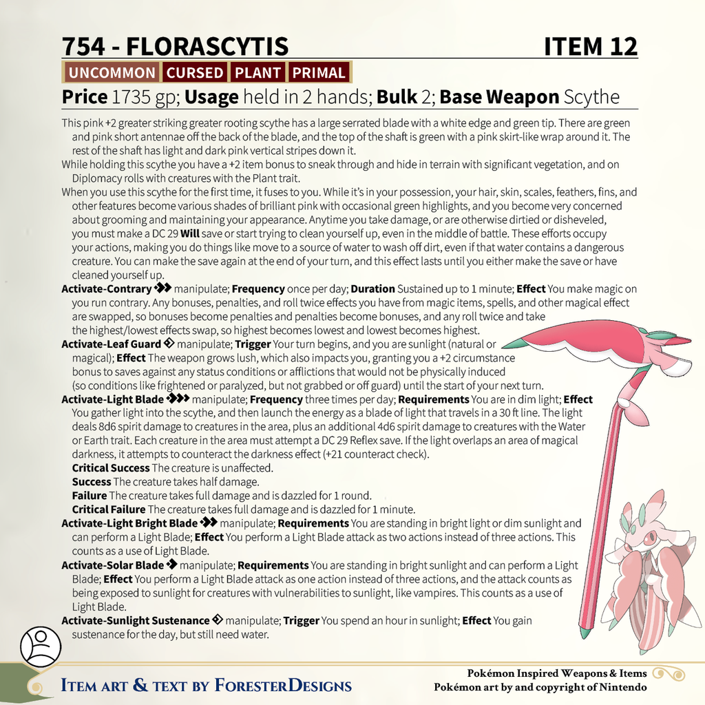 A #PF2e conversion of my older #Pokemon #MagicItems, with a #Lurantis #scythe to soak in the sun!