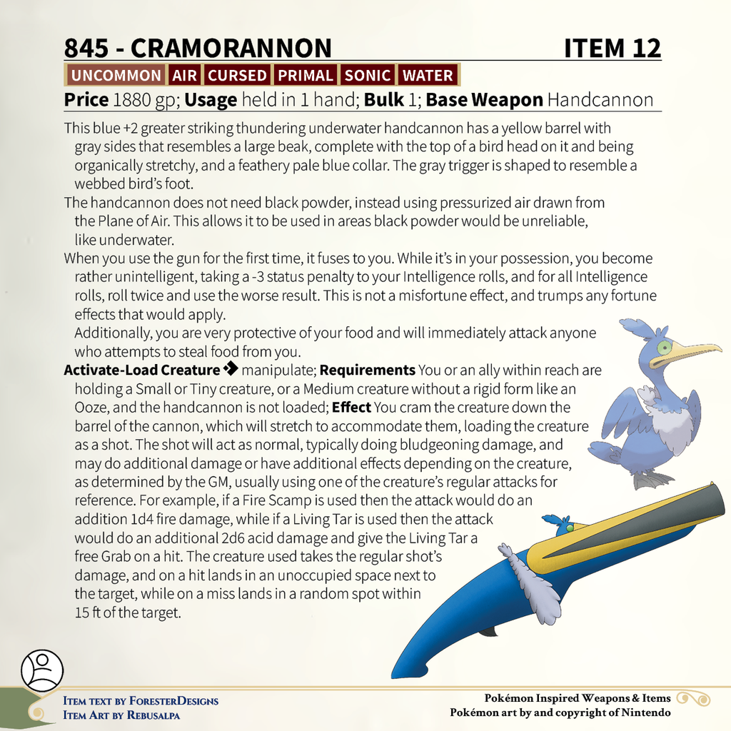 A #PF2e conversion of my older #Pokemon #MagicItems, with a #Cramorant #handcannon to shoot some creatures