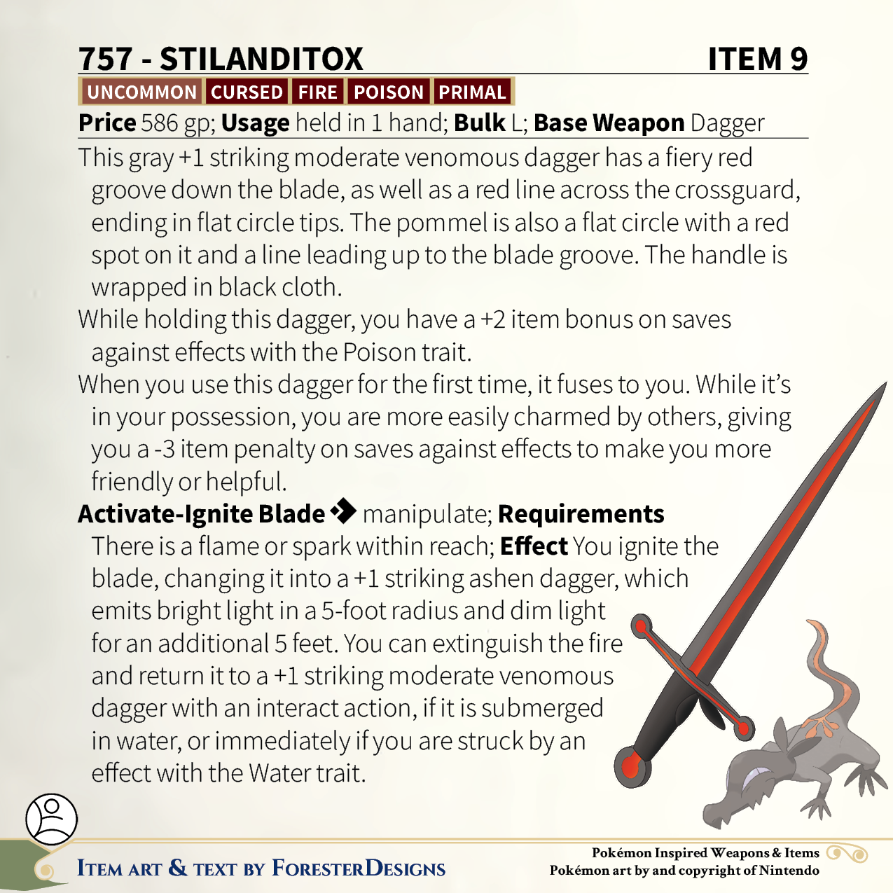 A #PF2e conversion of my older #Pokemon #MagicItems, with a #Salandit #dagger to make you really helpful