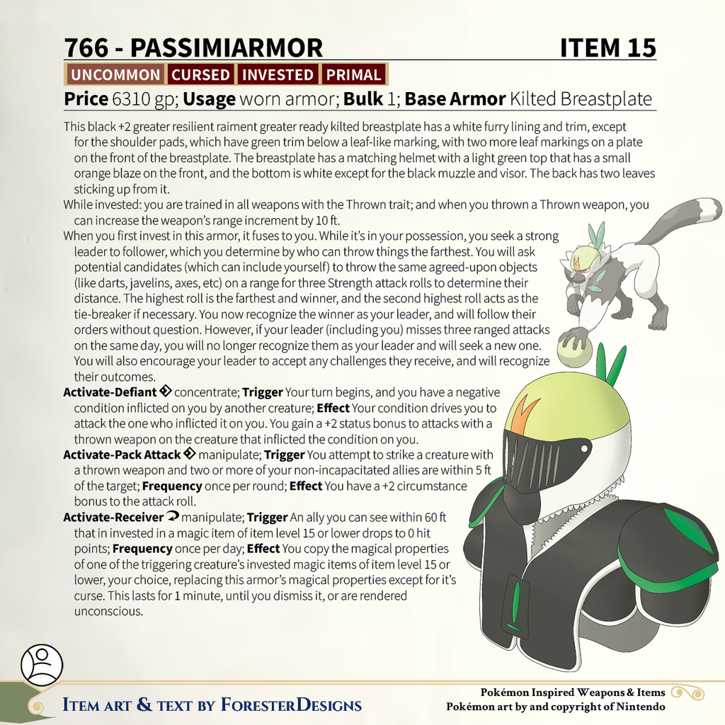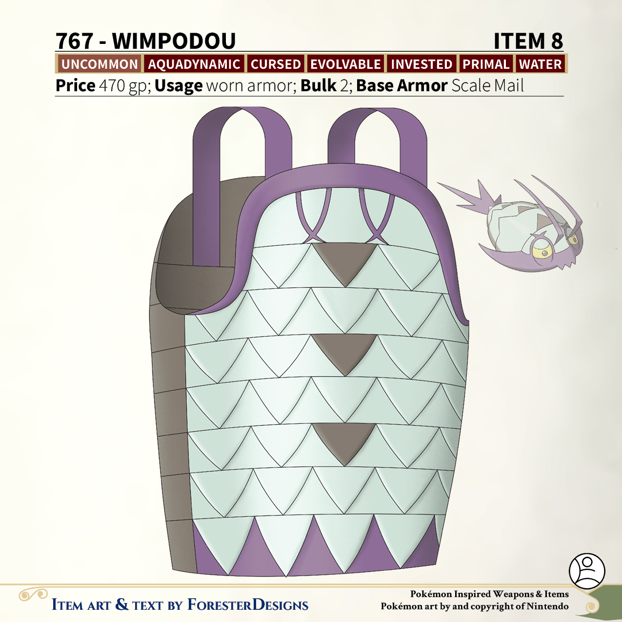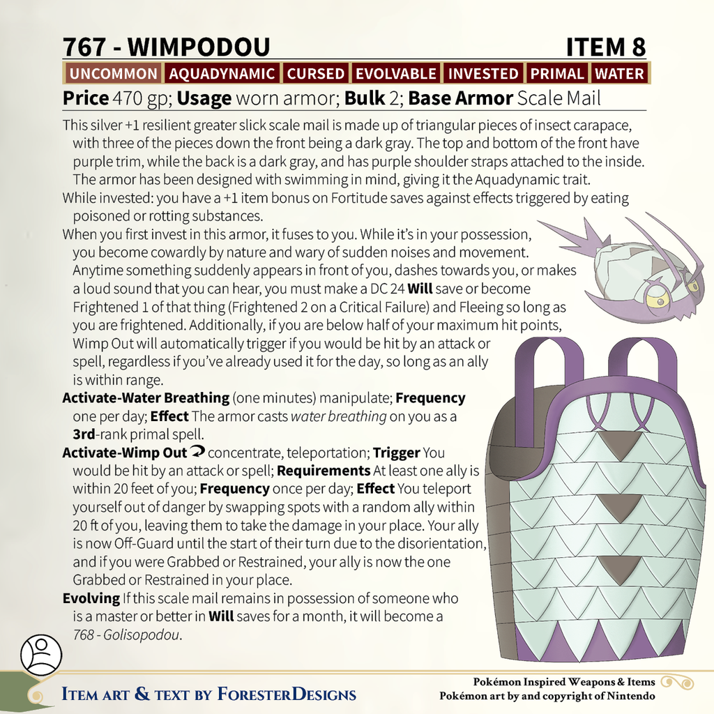 3. A #PF2e conversion of my older #Pokemon #MagicItems, with some #Passimian #armor to help you throw your weight around, and some #Wimpod #armor to help you get out of danger!